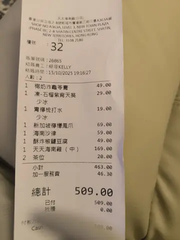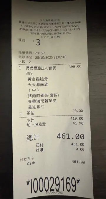 今晚跟爸爸慕名而來這間位於沙田店的天天海南雞!這間餐廳是新加坡的過江龍!最有名吃海南雞!及其他一些新加坡地道的菜式!看過餐牌有數款不同的套餐可以揀選!今晚點了這客套餐相當抵食,有小吃、肉骨茶、雜菜煲、還有最出名的天天海南雞!黃金雞脆骨,金黃香脆!吃起來還有鹹蛋黃香氣!而且脆卜卜的,相當好咬口!超惹味的一道小食。天天海南雞,非常出色!無骨的海南雞件啖啖肉,肉質又嫩又滑,而且還有三款秘製醬汁,甜豉油、薑蓉和辣醬,每一款醬汁都各有特色及味道,配上雞件來吃,又有不同的味蕾!海南雞份量充足,大滿足!吃海南雞,當然少不了配上雞油飯!雞油飯又香,飯粒又軟綿綿!用來一同吃海南雞相當滋味!豬肉肉骨茶,相當美味及豐盛!用熱鍋盛着肉骨茶,一邊加熱着,慢慢飲,也不用怕會變凍!肉骨茶超足料,有棒棒豬骨,啖啖肉超級惹味!豆卜,超入味!還有冬菇、爽口彈牙豬肉丸!超足料超地道,值得一試!豆漿海南雞雜菜煲,這個菜煲非常濃郁,豆漿湯底清甜,而且還有滿滿的蔬菜,非常清新健康!仲有大量菇菌、紅蘿蔔、粉絲等等材料,非常豐富!…查看更多