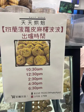 已經買過好多次嘅麵包舖,除咗有普通麵包,仲有麻糬波波同菠蘿皮麻糬波波,我主打買菠蘿皮麻糬波波。菠蘿皮麻糬波波有5款味,原味、斑蘭、朱古力、紫薯同咸蛋黃。菠蘿皮買8個以上免費有盒。其中大推斑蘭味,麻糬波波本身好濃斑蘭味,中間再加咗啲朱古力粒,其實唔知點解佢同紫薯味都要加朱古力粒係入面。菠蘿皮偏甜,包實個波波,每個都好大粒,質地煙韌。應該係斑蘭最多人買,所以佢有寫明呢款味嘅出爐時間。暫時佢都係以小店為主,同埋唔係主打賣麻糬波波,而且未有太多人知,所以我買過幾次都完全唔洗排隊。…查看更多