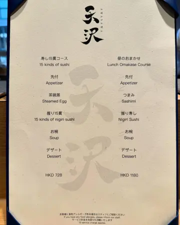 這間位於尖沙咀的天沢,乃城中預約困難店,裝潢以木系為主調,環境高雅舒適,主打傳統江戶前壽司,食材嚴選每天由日本空運直送,提供不時不食的優質廚師發板。🫧寿し15貫コース15 kinds of sushi $728🦋先付 Appetizer水果蕃茄清甜解渴,配搭日本水菜,清新開胃。🦋茶碗蒸Steamed Egg以高湯及蟹肉烹調,入口滑溜。握り15貫15 kinds of nigiri sushi🦋天然真鯛|肉質嫩滑,口感一流。🦋天然平目魚|以梅醬調味,魚味鮮郁。🦋赤貝|師傅拍打過令其口感更爽脆。🦋禾稈草燒鰹魚 |經禾稈草煙燻過,突出鰹魚的鮮甜真味,鮮而不腥。🦋昆布漬白蝦|鮮甜的白蝦中間夾住柚子皮,再加上昆布漬,令甜度提升。🦋石垣鯛|口感帶黏口彈性,具獨特油香,垂涎三尺。🦋鰤魚|油潤光澤,以柚子胡椒調味,令人食指大動。🦋墨魚|切成條狀的墨魚,入口更易咀嚼,鮮美盡現。🦋赤身|來自靜岡縣衣豆下田的赤身,熟成20日後製成醬油漬,魚身帶甜。🦋霜降拖羅|油份較重,唇齒生香,大滿足。🦋秋山水產馬糞海膽|入口即化,濃郁鮮味在口腔綻放。🦋手釣池魚|口感較爽身,以茗荷提鮮去腥,百吃不厭。🦋竹蝦|師傅將竹蝦弄至半生熟,令甜度及爽口口感更平衡。🦋赤鯥魚|油份偏重,經備長炭燒過,炭香撲鼻撩起食慾。🦋鯖魚卷|最令人驚喜的壓軸一貫,將鯖魚、白板昆布、紫蘇葉卷成鯖魚卷,最後以備長炭增添香氣,有如畫蛇點睛,味道層次豐富。🦋お椀 Soup蜆湯🦋デザートDessert開心果雪糕