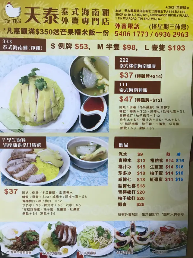 天泰泰式海南雞外賣專門店 (天水圍) 網址: https://s.openrice.com/QrbS0miO000 地址: 香港天水圍天湖路1號嘉湖新北江商場地下A150號舖 電話: +852 69362963