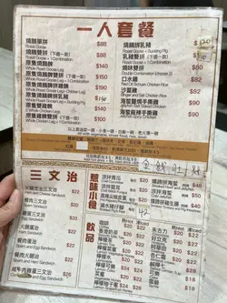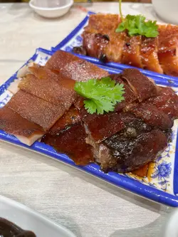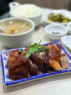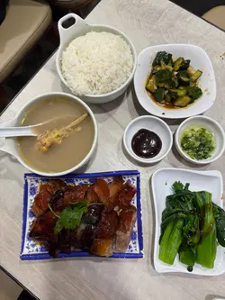 每日都在灣仔轉車回家,這晚想先吃過晚飯才回去,邀約同事一起,大家都想食燒味飯,來到了天龍燒鵝,晚市時分進去,店裡幾乎坐滿,可見燒味在香港人的心目中地位是很高的!我們都點了一人套餐,主打燒味或者手撕雞,配油菜、小食、白飯和老火湯。先上的是紅蘿蔔粟米豬骨湯,一看就是老火湯,顏色濃郁。喝一口,清甜夠味,沒有味精感。酸辣青瓜小食很開胃,酸甜爽口,青瓜爽脆,瞬間打開味蕾。油菜是菜心,淋上蠔油,簡單家常。主角登場,我點了乳豬燒鵝雙拼。燒鵝皮脆肉嫩,咬下去有肉汁,鵝油香在嘴裡化開;乳豬更是驚喜,皮脆鬆化,沾一點甜醬,邪惡又滿足。朋友點的燒腩仔叉燒雙拼同樣出色。燒腩仔皮脆肉香,肥瘦適中。叉燒半肥瘦,蜜汁香甜,肉質軟嫩,非常下飯。看著鄰桌的五寶飯什麼都有,賣相吸引,心裡暗記,下次一定要試。…查看更多