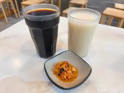牆壁上掛着大大個餐牌,筆者依個時間,當然二話不說就點下午茶餐啦!枱上調味餃子,最吸睛就是那辣菜莆。豆豉辣椒菜甫,未算太辣,很惹味,恰到好處。