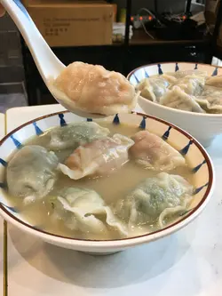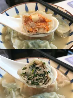 滋潤雪梨茶~下午茶餐配飲品,而且不用加錢可以配雪梨茶,酸甜度幾爽。迷你版有5隻湯餃,湯底是野葛菜生魚豬骨湯,食店標榜每天新鮮熬製4小時不加味精,牆壁上的餐牌還註明湯底的功效,誠意可加。