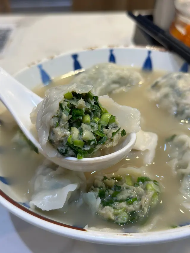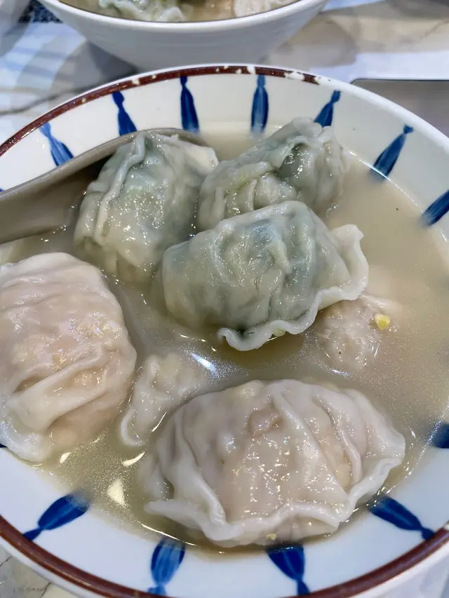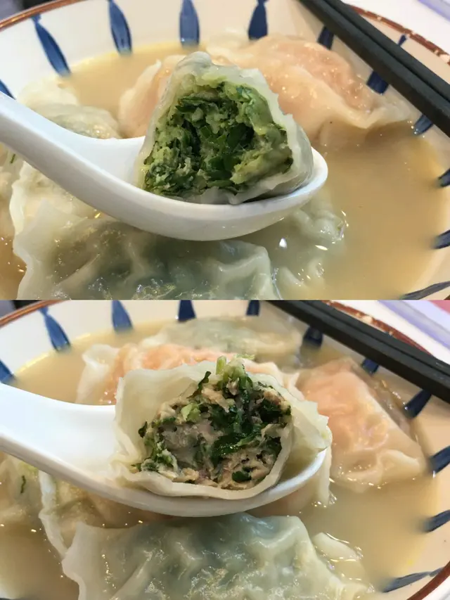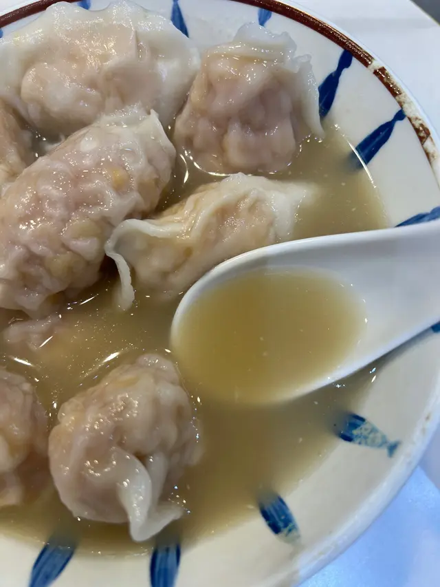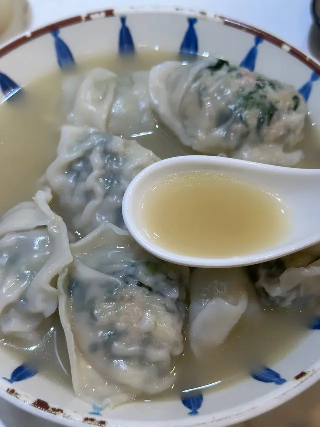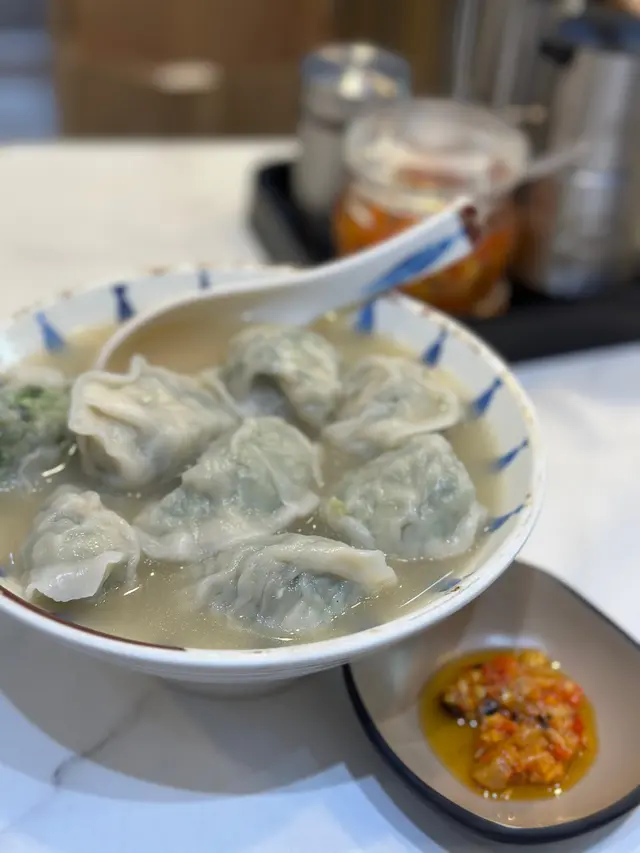 滋潤雪梨茶~下午茶餐配飲品,而且不用加錢可以配雪梨茶,酸甜度幾爽。迷你版有5隻湯餃,湯底是野葛菜生魚豬骨湯,食店標榜每天新鮮熬製4小時不加味精,牆壁上的餐牌還註明湯底的功效,誠意可加。