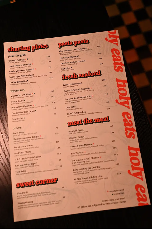 Just tried Holyeats in Central — such a cool spot! 😎 Loved the laid-back vibe and the food was seriously on point. We ordered:𐄁𐄙𐄁𐄙𐄁𐄙𐄁𐄙𐄁𐄙𐄁𐄙𐄁𐄙𐄁 ☰ ᴍᴇɴᴜ 𐄁𐄙𐄁𐄙𐄁𐄙𐄁𐄙𐄁𐄙𐄁𐄙𐄁𐄙𐄁👅•𝗛𝘂𝗺𝗺𝘂𝘀 𝘄𝗶𝘁𝗵 𝗢𝘅 𝗧𝗼𝗻𝗴𝘂𝗲• $𝟭𝟭𝟴First time trying this combo and it totally worked! Rich and tasty🧡🦀•𝗖𝗿𝗮𝗯 𝗖𝗮𝗸𝗲• $𝟭𝟯𝟴One generous piece, super crispy outside and packed with meaty flavour (not mushy at all, amazing!)🥗•𝗦𝘂𝗺𝗺𝗲𝗿 𝗦𝗮𝗹𝗮𝗱• $𝟭𝟮𝟴So refreshing with citrus yoghurt, snap peas, cucumber and pine nuts.🍝•𝗣𝗲𝘀𝘁𝗼 𝗣𝗲𝗻𝗻𝗲• $𝟭𝟮𝟴So cheesy and full of flavour, loved it✨🌮•𝗕𝗲𝗲𝗳 𝗧𝗮𝗰𝗼• $𝟭𝟮𝟴🐑•𝗟𝗮𝗺𝗯 𝗦𝗸𝗲𝘄𝗲𝗿𝘀• $𝟵𝟴Overall - Great place for a chill meal with good food and good vibes 🙌⋆ ⋆ ⋆ ⋆ ⋆🐽 Overall : 8.5/10🐽 Revisit : Worth a try…查看更多