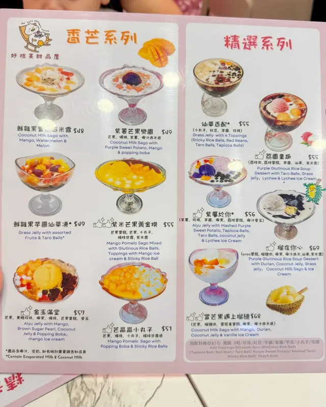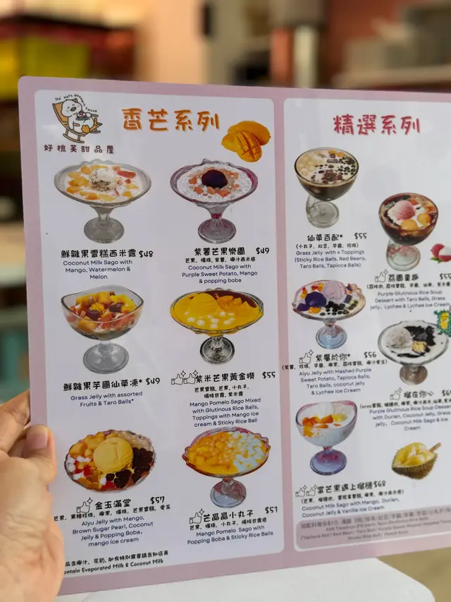 呢日去開石門上空手道,醒起朋友早排推介馬鞍山新港城中心嘅👉🏻好梳芙甜品屋👈🏻話呢度環境好打卡able,甜品又夠高質🤔一於搭幾個站過嚟試吓係咪真係咁正先🤔我地order咗🍨紫米芒果黃金撈 $55芒果雪糕|芒果|小丸子|楊枝甘露|紫米露成碗勁足料😍😍😍小丸子好煙韌👍🏻楊枝甘露同紫米露味道勁夾🍧金玉滿堂 $57芒果|黑糖珍珠|椰果|爆珠|芒果雪糕|愛玉睇完成個餐牌一次我就決定要叫呢碗,因為成個配搭都係我至愛😍😍😍😍😍芒果勁甜,黑糖珍珠唔會太韌,芒果雪糕裡面係有果肉架😍🍨心太軟配雲呢拿,oreo雪糕 $65心太軟送到嚟時入面仲係好熱,一切開入面嘅朱古力流心即刻流晒出嚟😍食到暖笠笠又香濃朱古力味配合埋雲呢拿/oreo雪糕一齊食,一凍一熱非常滋味😋😋😋🍧西瓜奇緣 $72西瓜奶雪冰|西瓜|椰子布丁|雲呢拿雪糕西瓜粒起沙👍🏻西瓜奶雪冰奶味勁香濃😍連埋椰子布丁一齊食味道好match,而且椰子布丁滑滑嘅質感mix埋西瓜奶雪冰好綿嘅質感成件事好特別朋友真係無介紹錯,喺馬鞍山呢個美食沙漠都搵到間咁高質嘅甜品店👍🏻👍🏻👍🏻其實仲有好多款甜品都想試,下次過開嚟馬鞍山試埋佢先😏查看更多