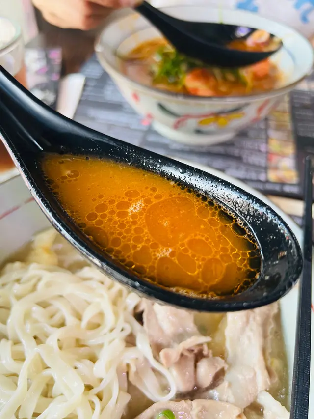 一早跑完步再同鄰居打完pickleball, 實在有啲肚餓。大家建議出去大圍食碗麵,呢間都bookmark咗一段日子。但係好耐冇落過大圍,所以完全忘記咗佢。叫咗個花膠雞湯麵同埋個蝦湯麵。先上咗個花膠雞湯,飲落去超膠口,呢種好厚實嘅感覺實在對得住個價錢。呢款面嘅質地雖然唔係我嘅編號,但係唔似上海麵嗰種粉粉地嘅感覺,都係可以接受嘅。另外比較欣賞係佢嗰個豬肉,冇諗過佢咁薄切嘅豬肉都有醃過呢個真心驚喜,醃料隱約食到好似蝦醬嘅味道。另外都試咗鄰居個蝦湯,蝦湯都好飲,但係都係花膠雞出色啲。另外黑豆水就偏淡,不過清清地都係好嘅。另外食蝦嘅話,有張濕紙巾俾你,真係相當細心!…查看更多