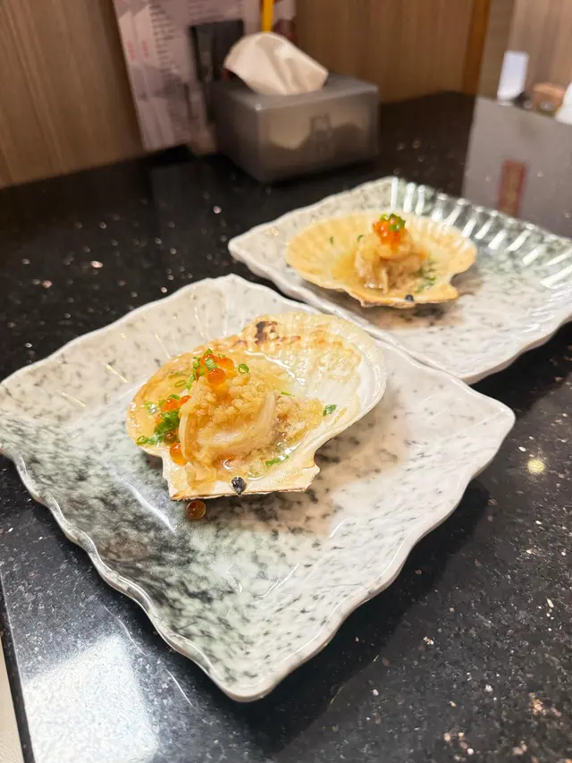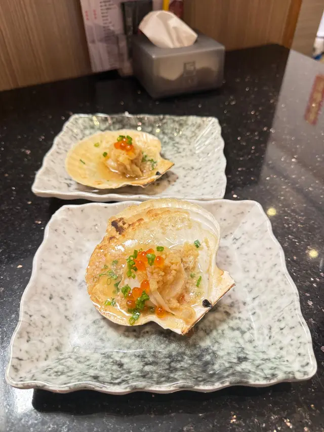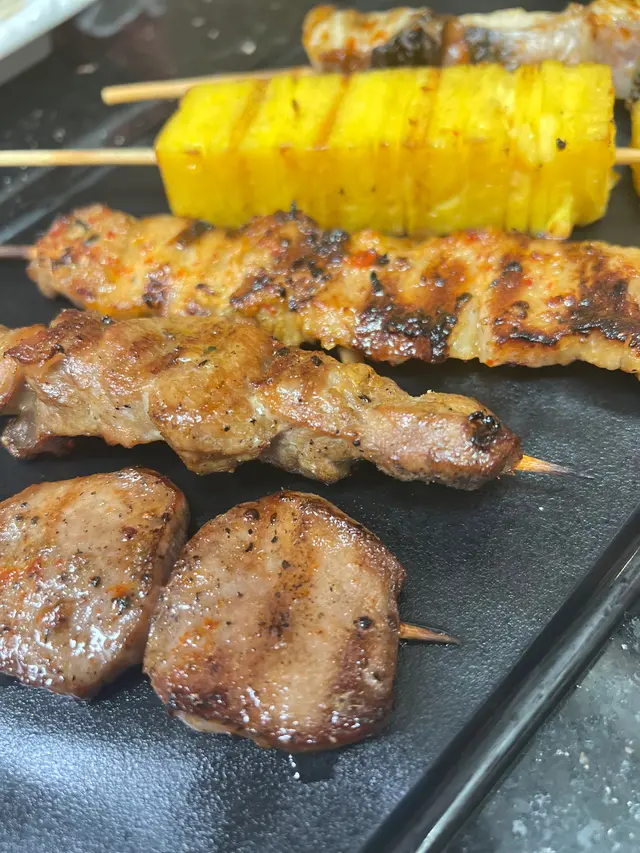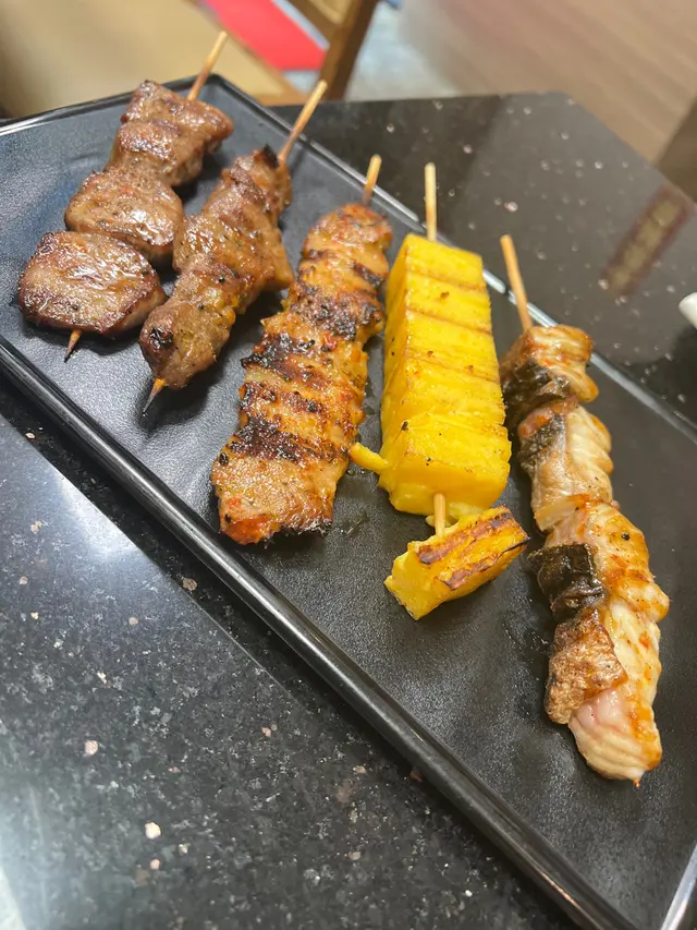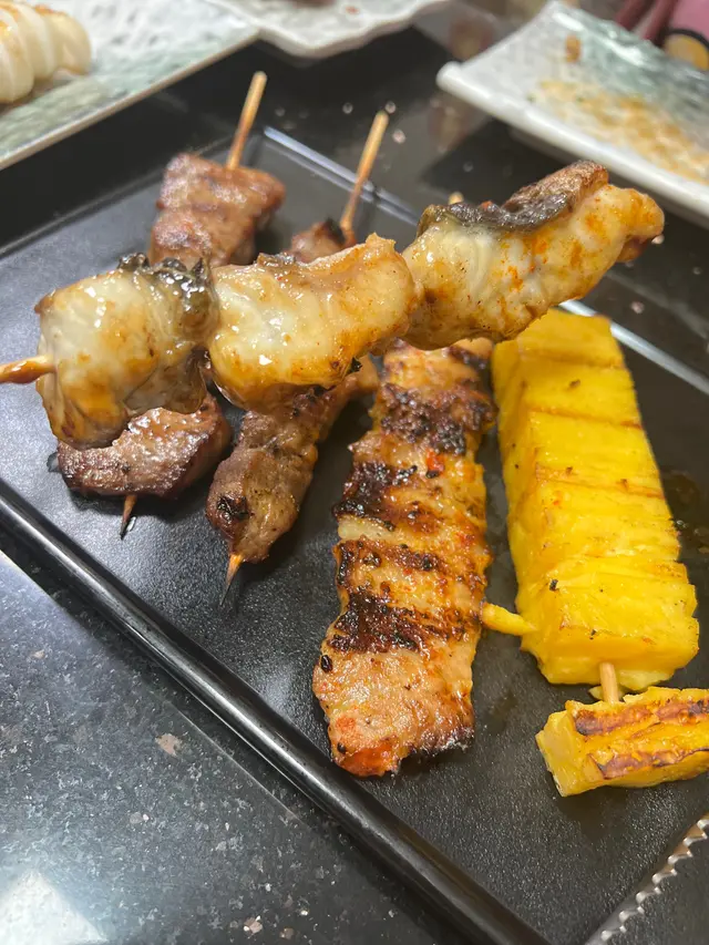 約咗友人飯局,點知佢臨時要北上工作一陣,但會趕得切飯局時間。為咗唔想佢咁趕,今餐飯聚地點去咗呢間串燒專門店。位置就係旺角睿景酒店對面,附近就有中國旅遊巴士站,落車行過黎都好近,我可以一邊食少少串燒飲吓嘢,一邊等佢黎。見到燒烤部,師傅接單後即燒,密密手不停燒。落單後,最先出場係蒜蓉燒聖子王 ($160/2隻)切好幾段方便易食,蒜蓉加爽彈聖子肉,無得輸。自選串燒拼盤燒好上枱,有鹽燒白鱔($49),鹽燒牛舌串 ($30),鷄中翼 ($22/2隻),鷄腎串($20)及魷魚鬚 ($28)。鹽燒白鱔有兩件,燒得皮香鱔肉仍帶油香。牛舌無點牛舌芯,但肉質都軟身,唔係柴乾舌,點酸辣汁/加幾滴檸檬汁都可以。其餘幾串都燒得唔錯,趁熱食。黎得食串燒,蔬菜類中點少得蒜蓉燒茄子 ($40),可選擇原條/切片,我鍾意原條上。蒜蓉舖滿成條茄子肉,輕輕一夾已可一注夾起,軟綿加蒜香,個人自肥必食。友人唔食得茄子,佢叫咗牛油金菇包 ($40),金菇菜以牛油一齊煮,入口嫩滑之餘多一份牛油香味。另一轉串燒,有串燒豆腐 ($22)及豬仔髀 ($42/2支骨)串燒豆腐外脆內嫩,外皮唧上甜甜地嘅醬汁,好食。豬仔髀第一次食,配上酸辣汁,拎起支骨就可以啖啖肉咁食,呢口價相當抵食。最後叫埋個鮑魚汁海鮮荷葉飯($108),份量夠2-3人食。打開荷葉後香味飄出黎,以蜆肉,蝦,仿鮑片,翠肉瓜粒及蛋絲快炒,飯粒夠乾身唔油膩,熱辣辣食返碗都幾正。宵夜時段去到凌晨兩點,夜歸人/夜鬼都唔驚無嘢食啦。…查看更多
