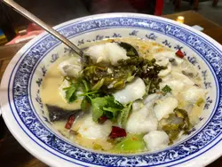 食酸菜魚當然揀老店,呢間25年老店位於北角,感覺傳統,並非走新派路線。中午時間,除咗餐牌上既各式川菜,亦有客飯小菜套餐,而且價錢平易近人,所以都有不少客人幫襯。藤椒酸菜魚 (桂花魚) 魚同湯都同樣高質。湯底既高質在於每日新鮮熬製,而非預製醬料或湯包,配合川味經典藤椒風味,清香麻爽。而魚則用上桂花魚,肉質細嫩爽滑。生煎手工鍋貼即叫即煎,熱辣辣,飽滿又多汁。乾煸四季豆四季豆表面微焦、乾扁熟軟,肉碎加上微辣,豐富的口感又帶有獨特既鹹香味道。雞絲粉皮粉皮呈卷狀,在雞絲同青瓜配合下,口感滿滿,麻醬令人吃得開胃。