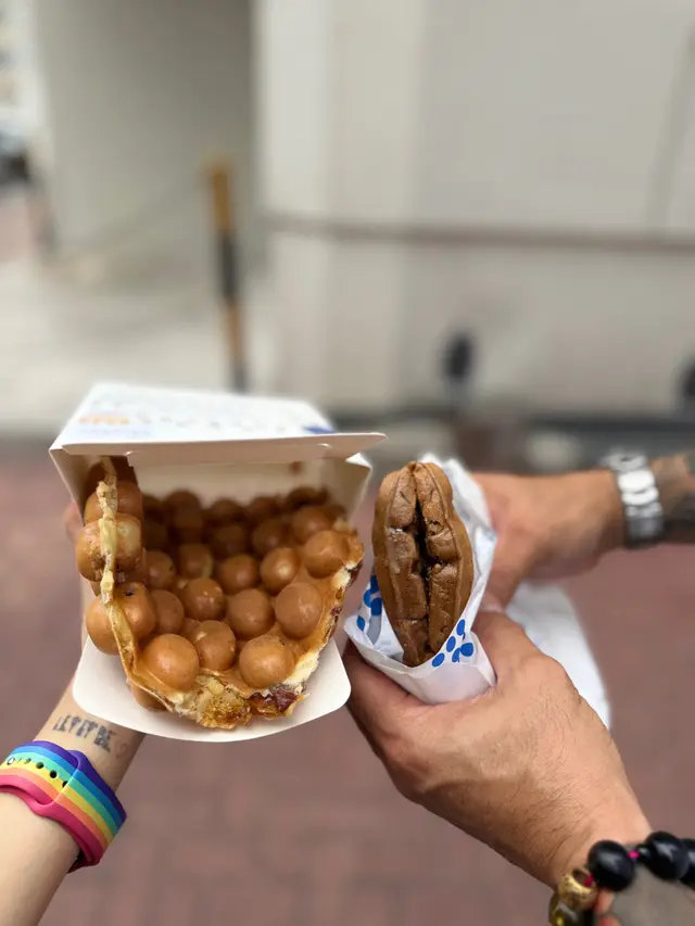 之前去中環行街果陣特登行去過中環街市買鷄蛋仔,係街市入邊,穩左一排先穩到,去到得一個女仔係出面點單,擔心要等好耐,叫做個原味雞蛋仔,20,其他加野或者係其他味就再貴少少,剛出爐好脆,雞蛋仔入面濕潤,凍左之後煙靭,好好食,我比較中意凍少少之後先食既,但係記得唔好扎埋個袋子口,係!要袋既話落單果陣就要出聲,姐姐比較無耐性。