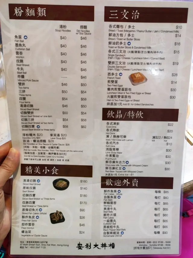 崩沙腩豉油撈粗$48:麵質爽口,呢個麵加左佢哋自己特製嘅豉油,味道可口,食唔出有太大陣鹼水味,好味👍🏽崩沙腩肥瘦適中有少許根位,唔柴口,一定會再叫呢個😬炆牛腩米粉$38:湯底夠晒濃味,加埋多蔥,配埋啲米粉食,再加埋辣椒油,啱晒啲重口味人士👍🏽👍🏽👍🏽炆牛腩同清湯腩相比,清湯腩會好食啲,不過如果就咁叫清湯腩米加腩汁,個湯冇咁濃,所以如果配米粉食,我一定會叫炆牛腩米😌鮮油奶多$16呢個名物,喜好甜品嘅你一定要嗌😆😆兩塊厚厚嘅多士夾住中間一大片嘅牛油,再加埋煉奶絕對係脂肪嘅來源😏咬一啖你就會知道咩係冰火兩重天😂😂啱啱烘熱嘅多士,再加埋凍嘅牛油😍😍堂食嘅話,真係唔可以唔叫🤣外賣嘅話就唔好叫啦,牛油會溶哂,加埋塊包會變到柴皮同埋唔熱👋🏽👋🏽👋🏽👋🏽Cp 值及夠飽: 女仕嘅話一碗就夠,男士嘅話要碗半先夠,相比起其他粉麵檔,佢係貴啲嘅,但有質素嘅保證,不過食完會口渴,食完之後要飲返多啲水啦😝翻啅:筲箕灣有其餘兩間出名嘅港式粉麵,但我次次去,九成都會食安利大排檔,最啱自己口味🙂查看更多