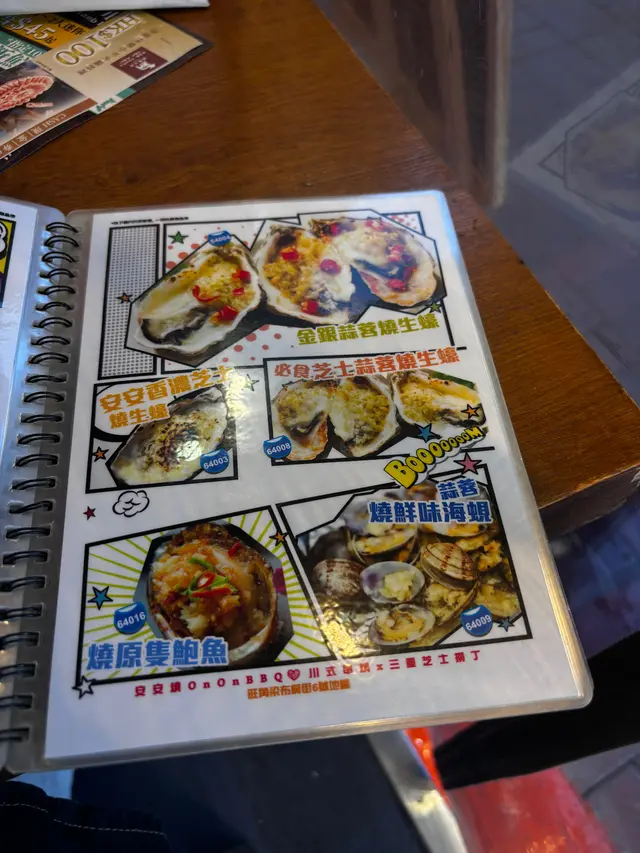 -惹味黑松露墨魚滑 $60-燒超惹味網燒魚干 $48依2款正路都唔會輸啦🫡可以一戰:-安安香濃芝士燒生蠔 $65 芝士味都濃郁嘅 但生蠔就有少少腥:(-蒜蓉燒鮮味海蜆 $53唔係唔好食 但又唔係好鮮甜:(搵啲嘢咬吓咁-燒韮菜 $25一般般啦可以唔嗌:(:-皇牌燒牛舌 $45望落咁厚身 有種莫名嘅期待 點知咬落去係好散 仲有陣羶味:(-燒脆皮芝士腸 $18唔脆嘅脆皮芝士腸