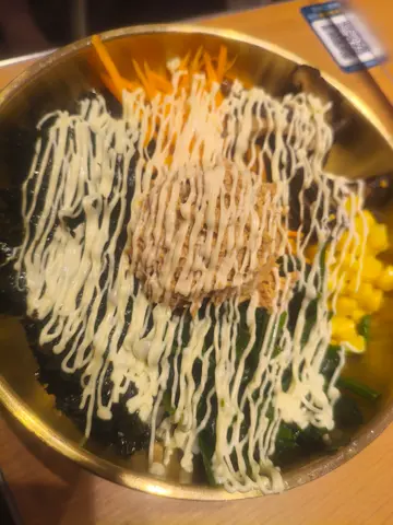 午餐人太多,穩左比較就腳就來咗依間人都多,但剛剛好有位果種吞拿魚拌飯分量來講,唔添飯嘅情況,都好足夠依方面算性價高但味道吧。衹能講不過不失,唔知係沙拉醬太多,定我叫嘅係吞拿魚關係,有啲甜膩整體唔系好覺食到韓食多種拌飯衹有泡菜話緊比我知,我食緊嘅係韓食😂任裝:醃蘿蔔泡菜、白飯、海帶湯,自助角落泡菜因為拌飯有就冇可以去試蘿蔔小小脆,但我覺得可以再多醃一段時間白飯ok,唔會話太硬太軟海帶湯我主要用來解膩,小咸,但算ok