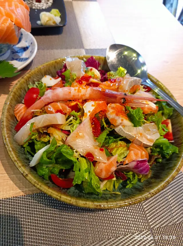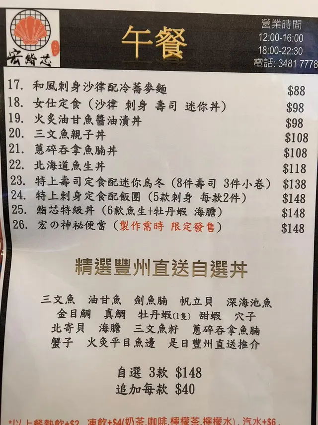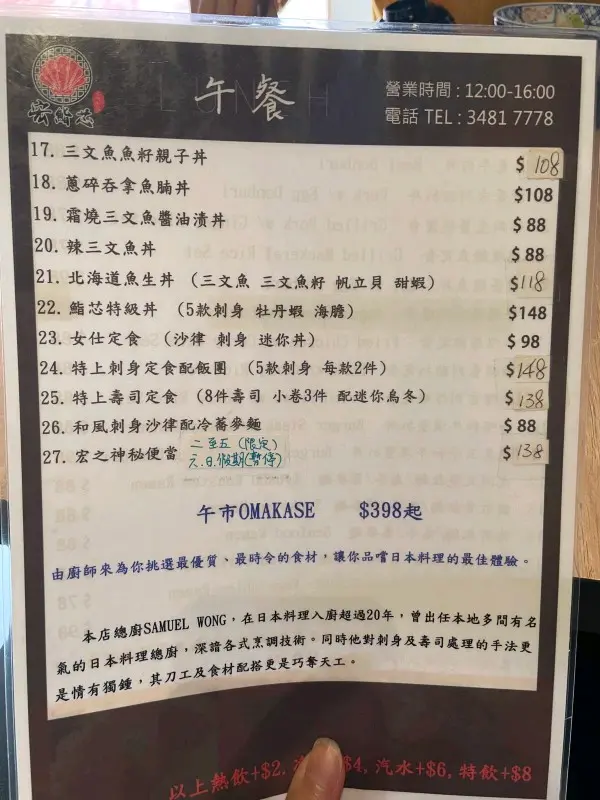 天氣熱到34度,相信好多人都會揀食刺身壽司,今日特登搭車過嚟,因為見到都有唔少好評,而且見佢午市套餐有做刺身丼飯,價錢合理啦,入到去空間都合理嘅,不過師傅服務員唔係好識點樣安排客人入座,反而要我提議唔介意搭枱,佢先至將一個近廁所嘅四座位分開兩個座位,其實都係好小事,同樣服務員係唔識得攞茶俾客人嘅,又唔見得呢一間店屬於自助形式,都唔緊要,期望食物好食啲啦,揀咗一個午市餐牌嘅148廚師發辦嘅壽司當飯,廚師發辦理應會揀合適嘅刺身放埋一齊,如果要熱嘢飲就加兩蚊,OK啦total$150, 上枱嘅時候就如圖,大大隻牡丹蝦確實吸引,不過竟然係有沙嘅,港督海膽都預咗佢唔會好多,不過識落都鮮甜嘅,其他嘅刺身魚各一塊啦,唔會話特別大塊,我諗我坐喺嗰度都等咗30至40分鐘,雖然我唔趕時間,但係服務員都知道我坐咗喺度好耐,食到一半嘅時候,服務員話唔記得咗攞沙律,其實都係啲菜碎淋啲汁… 總括嚟講一般般,唔係特別好食…查看更多