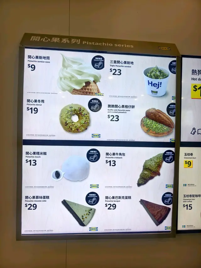 一年一度開心果食品又返嚟ikea啦~印象中上年食過雪糕都幾好味嘅,今年仲多咗好多款唔同嘅產品添。又有糯米糍格仔餅牛角包等等~不過就食咗一杯三重開心果雪糕同埋開心果糯米糍,網上啲人話格仔餅一般般所以都係唔試喇。唔知點解覺得今年嘅開心個雪糕好似冇咁好食,就咁食嗰個雪糕就冇乜開心果味,開心果味都係靠個開心果醬多啲。開心果糯米糍就更加有啲怪怪地,雖然佢個內餡係幾多,但味道一般,佢仲要放咗喺雪櫃,拎出嚟個皮都已經冇咁鬆軟,對今年嘅開心果產品都幾失望,試一次就算囉。