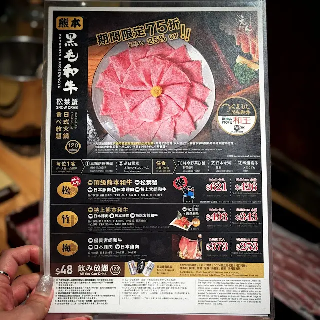 位於尖沙咀的「En宴」主打日式火鍋放題,以其高品質的食材以及暢快的飲品,而吸引不少客人前來。餐廳位於商廈一樓,裝修是日式居酒屋的風格,配上日本的沖繩元素的海報、設有榻榻米。擁有輕鬆、熱鬧的用餐氛圍。招牌 近江牛120分鐘火鍋放題 (松套餐)·奢華肉品:頂級的近江牛(日本三大和牛),肉質柔軟,霜降均勻。和宮崎和牛(4屆榮獲「日本一」殊榮的特上宮崎和牛),肉香濃郁,在鍋中輕涮幾下,入口即化。同時,松葉蟹也是放題亮點之一,鮮甜的蟹肉無限量供應,能滿足所有海鮮愛好者的味蕾。·完整的套餐體驗:除了無限量添加的肉類和蟹,套餐還包含三點刺身拼盤。而用餐後,提供清爽的柚子和濃郁的綠茶雪糕,能完美化解之前的油膩感,口味濃郁,口感輕盈。·豐富的配套選擇:菜單上還有日本豚肉、雞肉、時令野菜拼盤等多種涮品,還加了鬆脆的厚炸沖繩豆腐和汁燒自家製雞肉棒。·暢快飲品與用餐氛圍除了美食,飲品放題同樣令人驚喜,提供了多樣化的選擇來搭配火鍋。指定罐裝飲品包括:SAPPORO啤酒、ASAHI啤酒等,更有沖繩黃薑茶等解膩茶可以飲。聽店員說他們還推出日式火鍋放題每日10點後7折,星期日至四10點前75折/每晚10點後仲有深宵割引,10款指定菜式以及5款酒精飲品一律半價。等多元化優惠來吸引喜歡食放題的客人。…查看更多