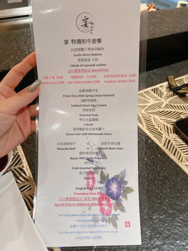 汁煮南非鮑魚汁煮南非鮑魚的味道極為鮮美,鮑魚肉質緊實,口感滑嫩,彈性十足,鮑魚在醬汁中慢慢煮熟,吸收了醬汁的精華後,散發出濃郁的海味與鮮香,帶有微微的甜味季節刺身三款刺身肉質厚實,油脂分布均勻,入口即化,肉質細膩,味道清淡而鮮美,帶有淡淡的甜味金槍魚腩手卷新鮮的金槍魚腩肉質滑嫩,帶有豐富的油脂,入口時彈性十足,散發出濃郁的海鮮鮮香,搭配的米飯柔軟黏稠,手卷外層包裹的海苔脆口,增加了口感的層次感海鮮茶碗蒸鮮嫩的雞蛋液經過蒸煮,呈現出絲滑的質地,入口時如絲般柔滑,搭配的海鮮,釋放出濃郁的海味,充滿鮮香,湯底的高湯熬製而成,帶有淡淡的鮮甜,與雞蛋的香氣相互融合,海鮮的鮮美與雞蛋的嫩滑,茶碗蒸不僅滋味鮮鐵板燒龍蝦新鮮的龍蝦肉質鮮甜,外層微微焦脆,內裡卻保持著多汁的口感,用上龍蝦膏和牛油做醬汁,入口非常香的龍蝦高味道,龍蝦的鮮甜更為突出香煎鵝肝半自家製醬汁香煎鵝肝的外層金黃酥脆,內裡則柔軟滑嫩,入口即化,帶有濃厚的奶香與獨特的脂肪味,每一口都能感受到鵝肝的豐富層次,微微的鹹味與甜味西班牙黑毛豬西班牙黑毛豬的味道極為豐富,豬肉肉質細膩,脂肪分布均勻,肉質鮮嫩多汁,入口即化,帶有微微的堅果香氣煙肉香蒜炒飯煙肉經過煎炒後,散發出濃郁的煙燻香氣,與炒飯的米粒相互融合,香蒜的加入,令味道更加鮮明,炒飯的米粒鬆散,吸收了煙肉的油脂與香味,口感滑順而不油膩炒雜菜炒雜菜的味道清新,蔬菜的鮮甜,經過熱炒後,保留了脆嫩的口感…查看更多