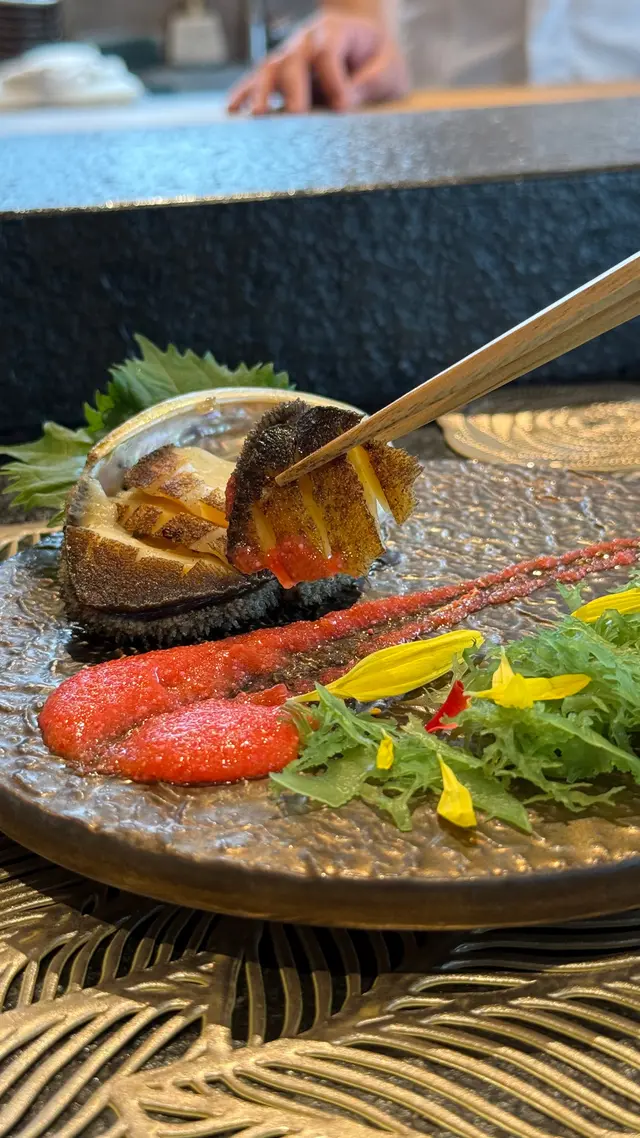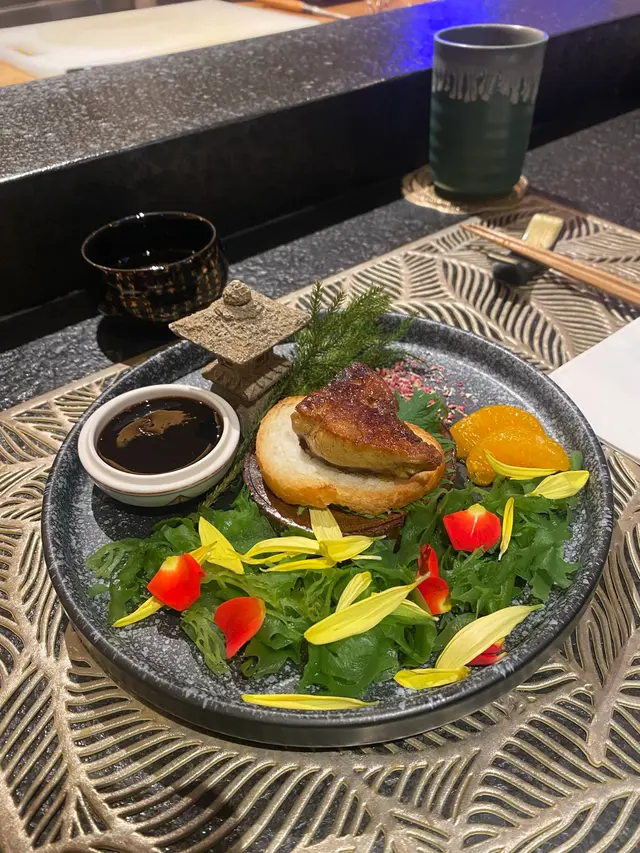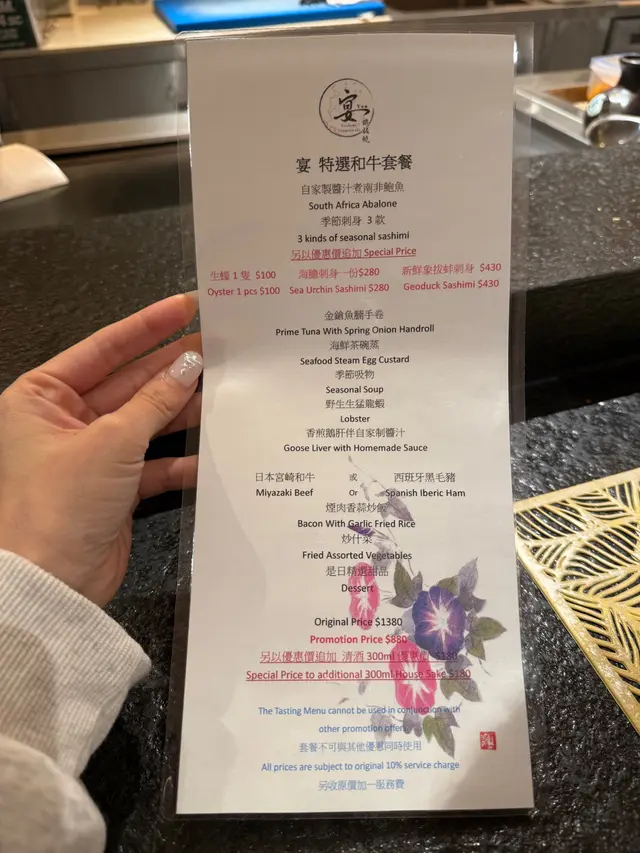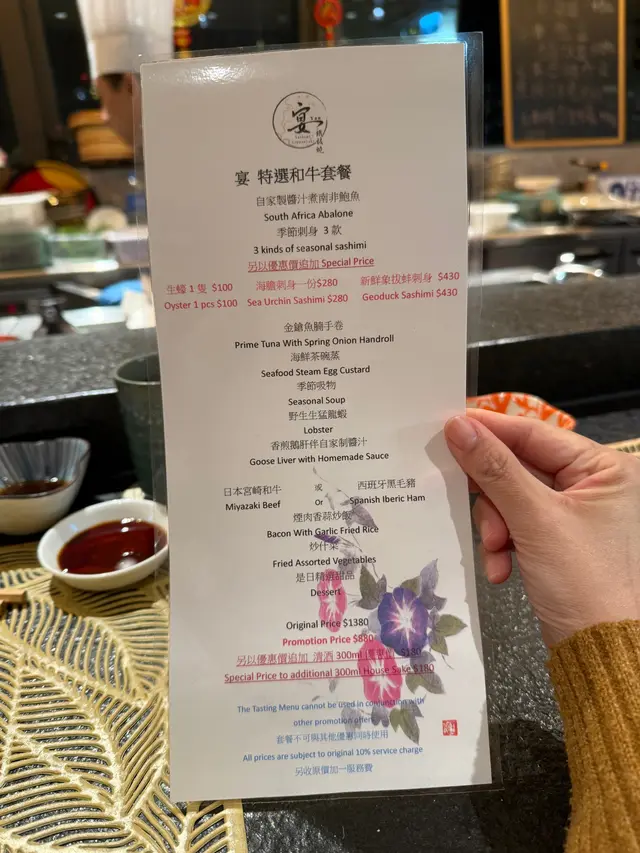天后有啲咩好食推介?今日就同大家分享一間可以望到香港同九龍夜景嘅鐵板燒餐廳——宴!✨ 呢度除咗景靚,仲可以即席欣賞師傅煮俾你食,真係視覺同味覺嘅雙重享受呀!餐廳主打特選和牛套餐,每一道都係精心炮製!頭盤有季節刺身,包括真鯛、油甘魚、大池魚,魚生質感鮮甜,仲有金鎗魚腩手卷!紫蘇葉同炸蒜片配吞拿魚蓉,層次感豐富得嚟唔會喧賓奪主。喜歡海鮮嘅朋友,必試南非鮑魚配自家製醬汁,同埋野生生猛龍蝦,師傅即席處理,睇住都覺得新鮮,入口肉質彈牙!仲有香滑嘅海鮮茶碗蒸同暖胃嘅季節吸物魚湯,真係啖啖滋味。主菜就更加冇得輸!日本宮崎和牛 或 西班牙黑毛豬,和牛口感嫩滑, 黑毛豬有濃既肉味. 香煎鵝肝亦係亮點,紅酒同黑醋嘅酸甜完美平衡。配埋煙肉香蒜炒飯同炒什菜,炒飯粒粒分明,什菜既日式XO醬仲帶有芝麻香氣,超級加分!最後甜品係抹茶奶凍,香濃又唔會太甜,正正好為一餐畫上完美句號!🍵睇得又食得嘅體驗,真係值得一試!🫶🏻…查看更多