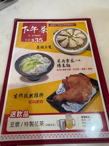 2pm後時間幫襯,客唔多唔使等位。檯面冇下午茶Menu,要問姐姐先會拿過來。叫咗碗擔擔麵、炸豬扒同豆漿。擔擔麵湯底唔夠濃郁、炸豬扒得半塊、豆漿正常。坐坐下越食越焗,原來全舖熄晒冷氣,連工包料$50,整體一般般