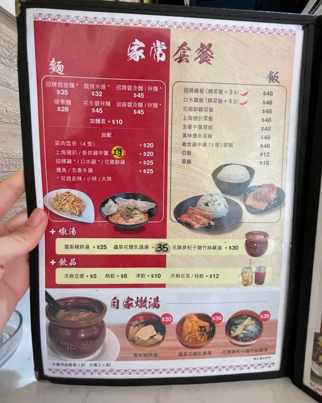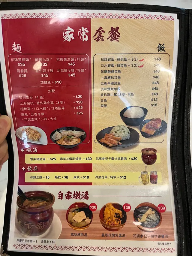 小店就是這樣充滿特色和驚喜。花旗參杞子燉竹絲雞湯,花旗參和杞子具有滋補身體的功效,湯底以雞湯熬煮而成,燉煮的過程使得雞肉變得嫩滑多汁,營養豐富。適合在寒冷的天氣中享用。擔擔麵,湯汁由豆瓣醬、花椒、花生和其他香料製成,帶有辣味和濃郁的感覺。麵條本身彈牙有嚼勁,搭配上肉末和花生碎,形成了一種美味的組合。可以根據個人的口味調整辣度,從而適應不同的喜好。自家製餃子,由新鮮的餡料包裹在薄餅皮中。水煮餃子、煎餃子或者蒸餃子。無論是作為主菜還是小吃,這道菜都給人一種親切和滿足的感覺。花雕雞,以花雕酒為主要調味料,以嫩滑的雞肉和花雕酒的香氣為特色。查看更多