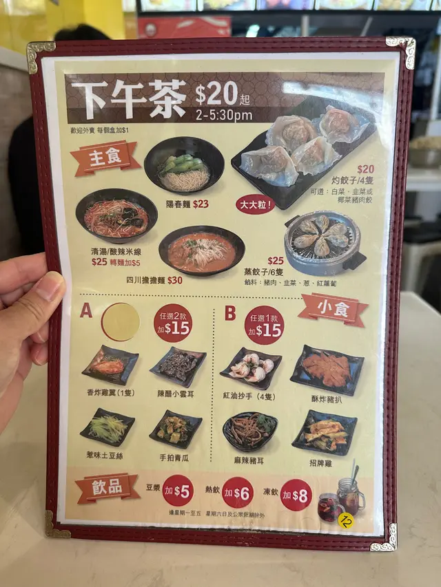 2pm後時間幫襯,客唔多唔使等位。檯面冇下午茶Menu,要問姐姐先會拿過來。叫咗碗擔擔麵、炸豬扒同豆漿。擔擔麵湯底唔夠濃郁、炸豬扒得半塊、豆漿正常。坐坐下越食越焗,原來全舖熄晒冷氣,連工包料$50,整體一般般查看更多
