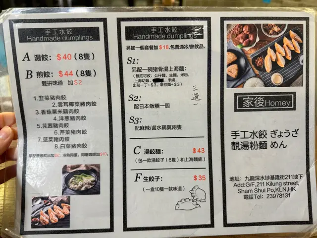 家後 (深水埗) 網址: https://s.openrice.com/QrbS0yXu4W0 地址: 香港深水埗基隆街211號地舖 電話: +852 23978131