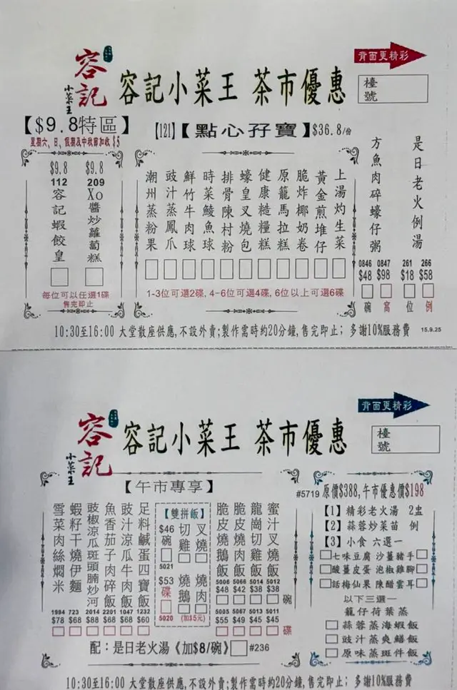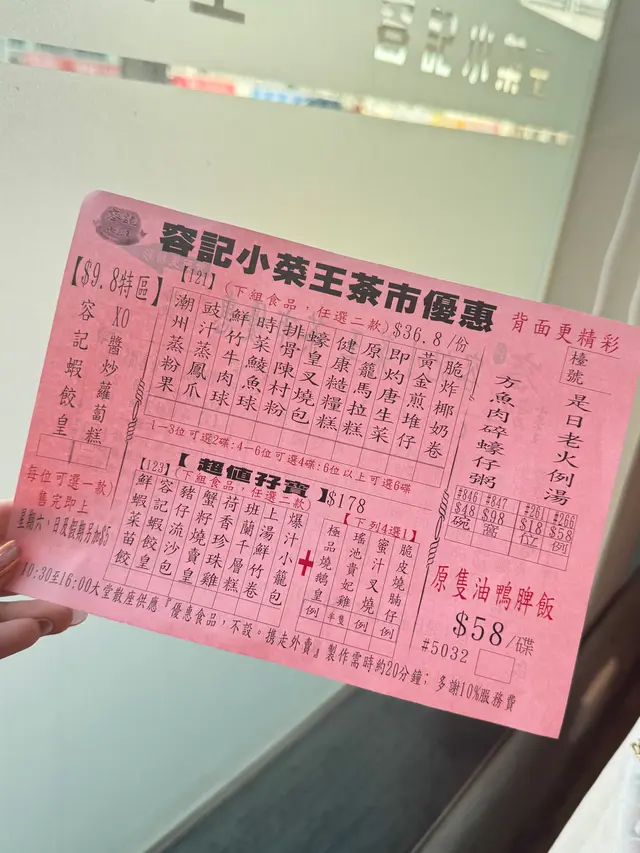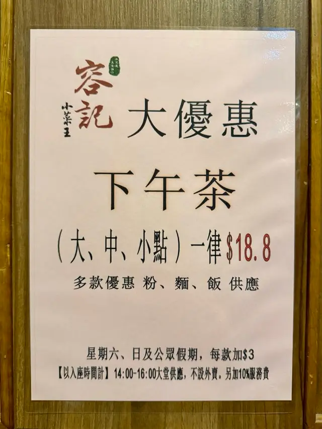 🧮熊妹成日都食西式下午茶,今日想食返中式味道。食中式下午茶就梗係要食返中式點心啦,要食經典嘅味道當然就搵返間酒樓就最原汁原味。熊妹行過太子,成日見到《容記小菜王》大大個招牌,估計都係最原始風味的小菜茶館。📌一撘𨋢上一樓,沿途都見到好多優惠海報。下午茶優惠,大中小點一律$18.8一款,假期就款再加$3。📌另外,仲有好多精選小菜,晚上8:30後宵夜時段仲有8折,可以晚餐大夥兒來聚餐。