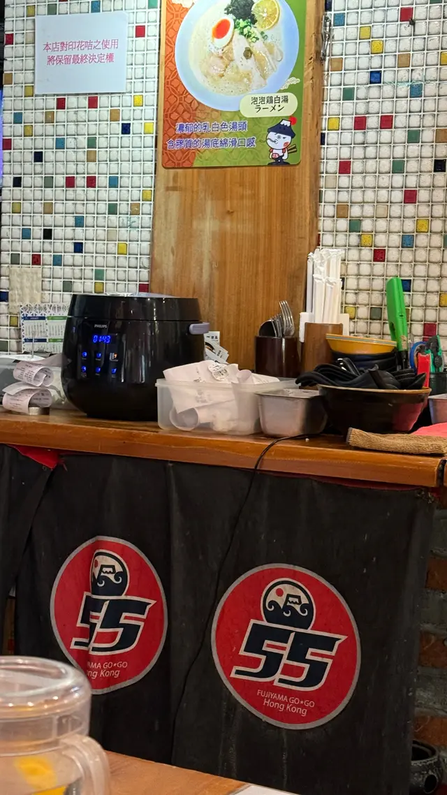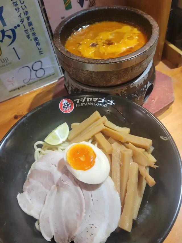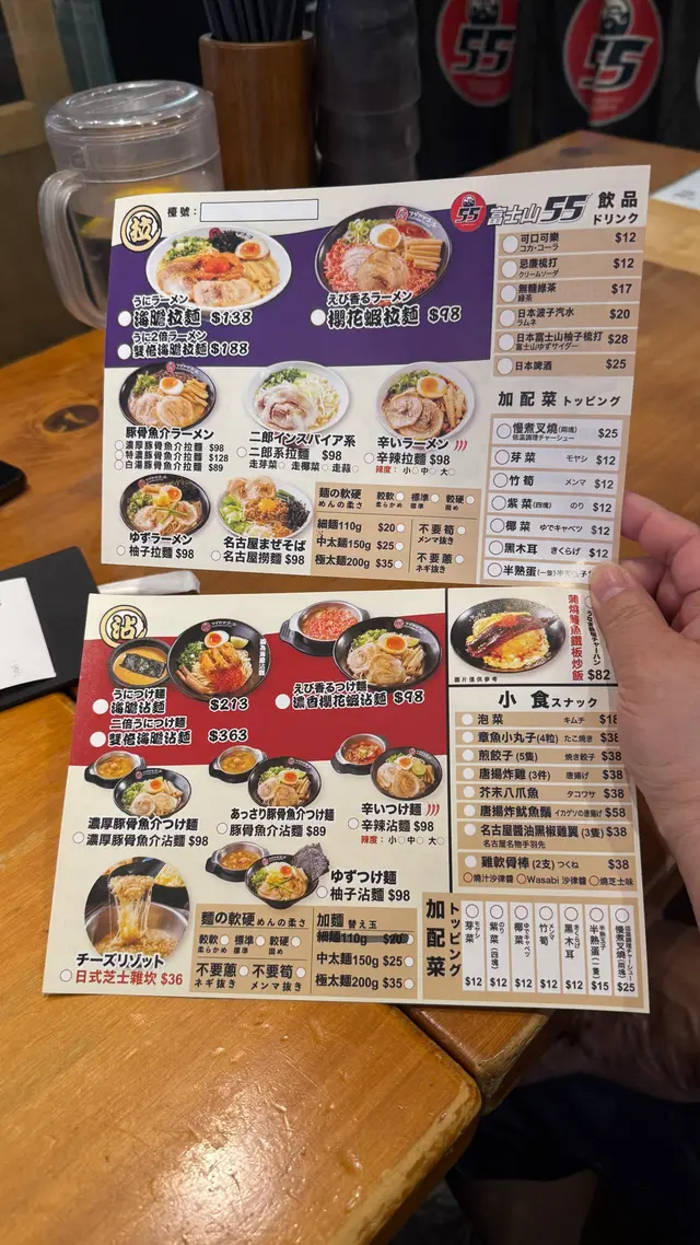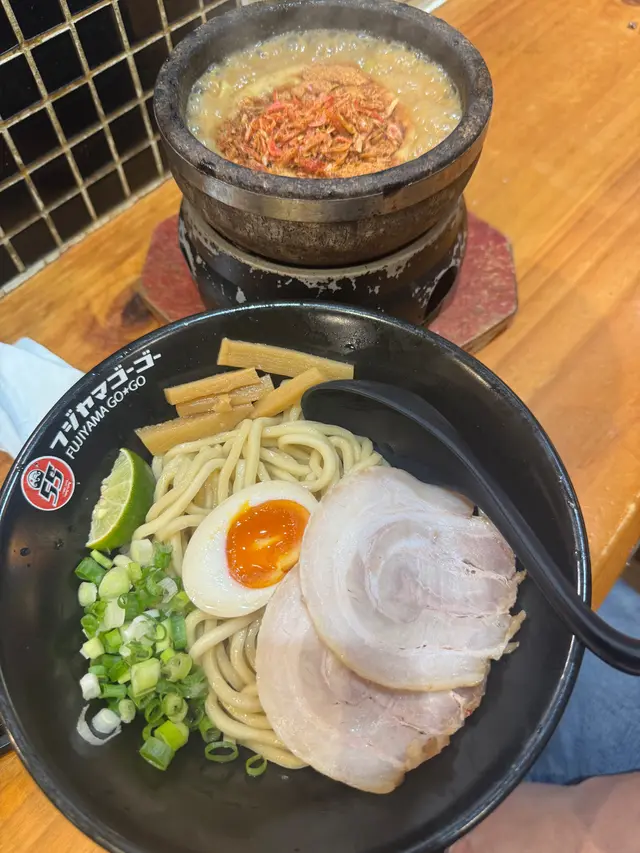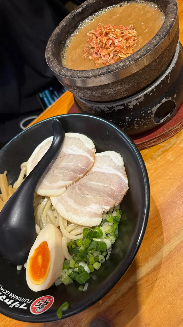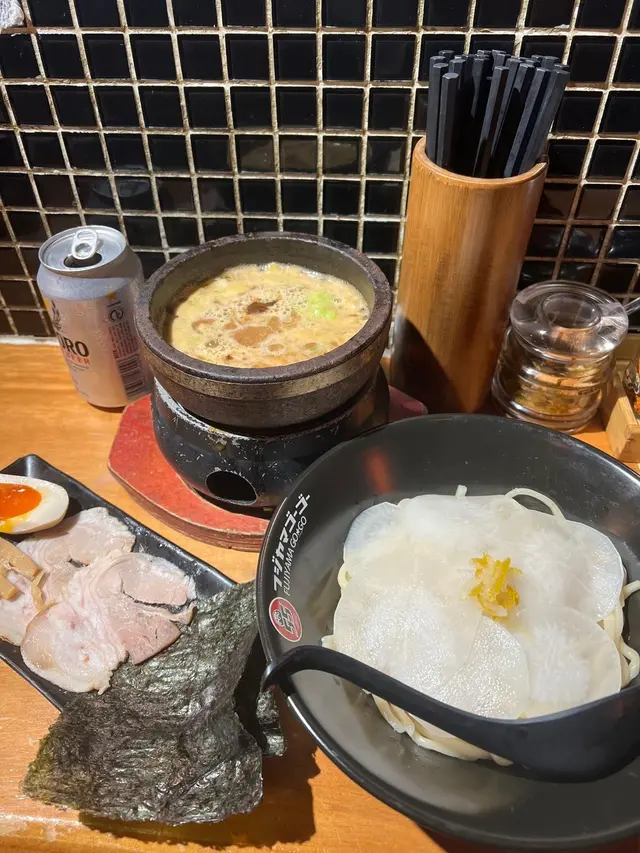 富士山55 (拉麵沾麵專門店) ,這次光顧感覺非常滿意。首先,沾麵的賣相非常吸引,麵條上鋪滿新鮮爽口的白蘿蔔片,配上少量柚子皮,帶來清新香氣。麵條煙韌彈牙,配合蘿蔔的清甜,令人胃口大開。沾汁以鐵鍋盛載,熱氣騰騰,湯底濃郁,帶有魚介香和豚骨味,鹹香適中,每一口都感受到用心熬製。配菜方面,有厚切叉燒、溏心蛋、竹筍和紫菜,叉燒肥瘦相間,入口即化,紫菜脆口,溏心蛋流心效果理想,十分加分。整體來說,富士山55的沾麵水準高,無論是麵條、湯底還是配料都非常出色。用餐環境乾淨舒適,服務親切,價格亦合理。推薦給喜歡日式沾麵的朋友,一試難忘!…查看更多