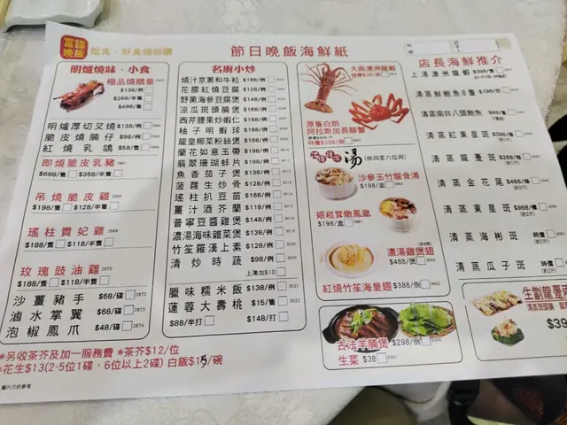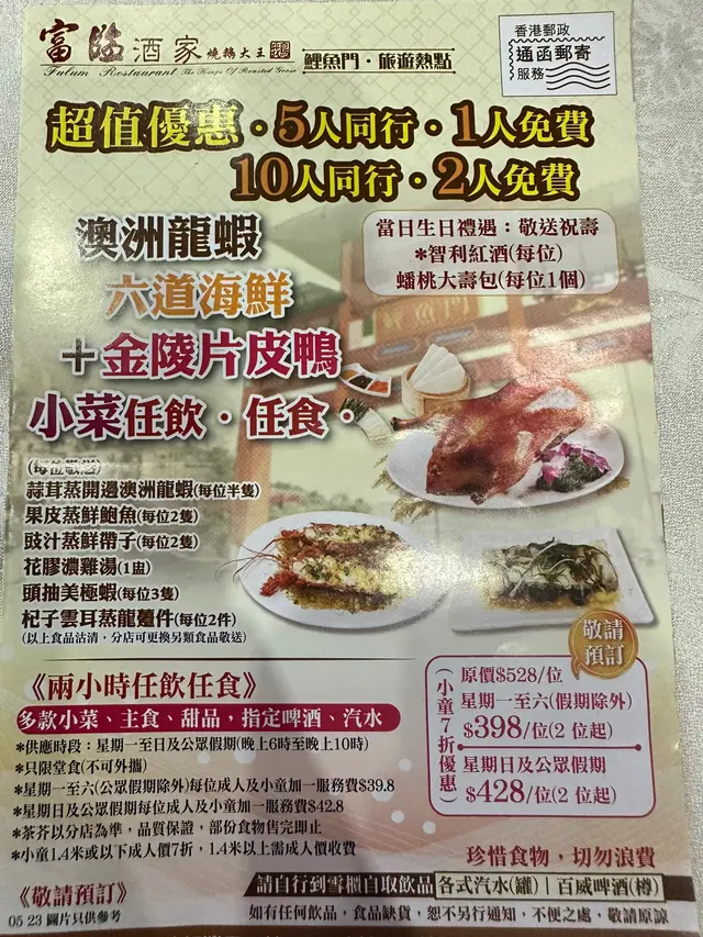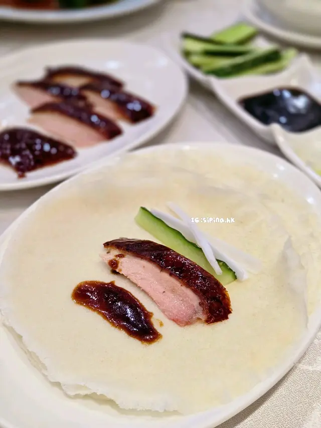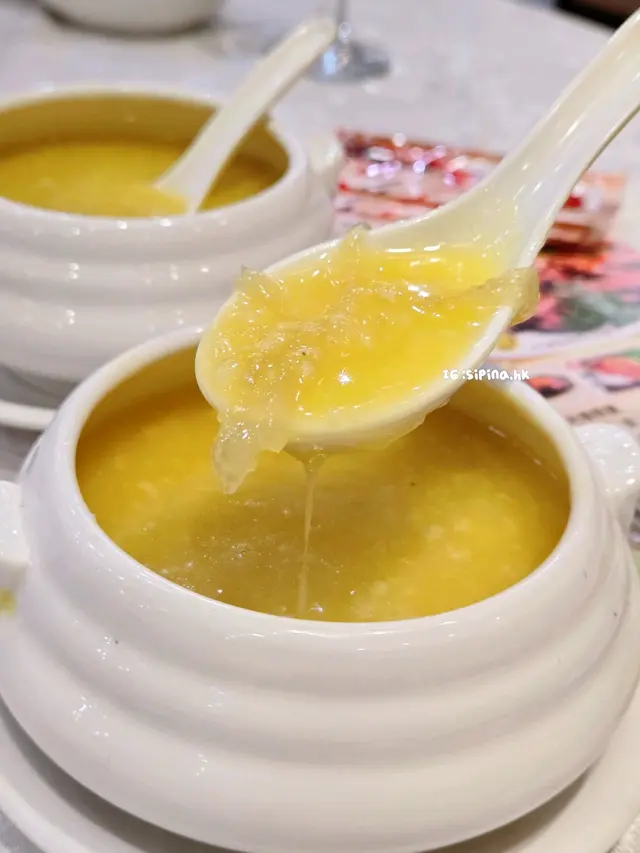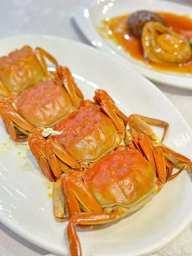 富臨酒家任食大閘蟹每人一份金湯燴燕窩、蟹粉扒豆苗、蠔皇鮑魚圖。一落單就有。行完鯉魚門,準備食晚餐,就見到呢間店舖2小時的大閘蟹放題。好吸引我哋呢種超喜歡食海鮮的人。除左金湯小米燴燕窩、蟹粉扒豆苗、蠔皇原隻鮑魚和回味欖角骨(只限定每人一份),其他都可以任食任飲。鮑魚軟硬適中,燕窩加入左些小米。我朋友覺得甜,而我則覺得咸。我們還點了片皮鴨,鴨皮脆口。大閘蟹有三款味道,分別是清蒸、油鹽焗和花雕蒸,我個人比較喜歡清蒸的大閘蟹,最是原汁原味;油鹽焗較咸香;而花雕蒸則有一陣陣酒香味。食完性寒的大閘蟹,當然要配上一壺薑茶驅寒和一碗糯米飯,糯米飯一碗的份量不是很多,所以不用擔心兩人食不完。.…查看更多