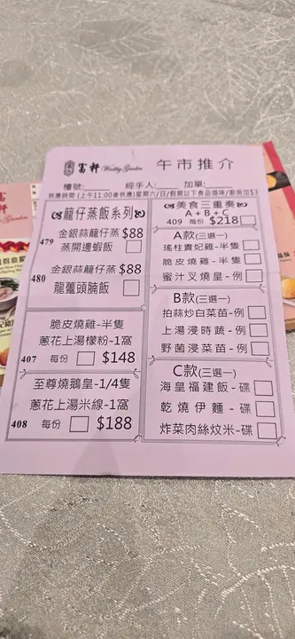 8月初揾食肥華和靚媽到此酒樓飲早茶,忘記咗食此店過咗早11:OO至有得供應嘅食品,紅燒花膠海皇翅所以在8月2O日肥華和靚媽,再一次到此店飲早茶,目標就喺要食呢碗翅。冇令肥華和靚媽失望,呢碗海皇翅嘅味道和份量,都令人滿意用$5O凌蚊價錢食呢碗翅可說是抵食,可惜今餐呢碗翅嘅熱度祇有微温,影响咗口感,確實犯咗食中式,羹湯唔辣口嘅大忌,呢一點實在要扣分。而今餐最出色嘅食物,依然喺個碟山竹牛肉,而最差嘅食物就喺碟,翡翠鮮蝦腸,呢碟腸粉主角啲蝦肉雖然夠爽但淡而無味更有蝦殼相連加上配角腸粉皮,口感亦差肥華將呢碟翡翠鮮蝦腸,評為負分食品亦問心無愧,今餐早茶食品整體值。⭐️⭐️⭐️⭐️