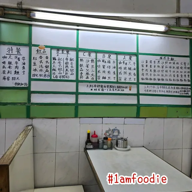相信如非老街坊應該不會找得到 除非像我故事找 原因也是因為yt說要清拆 也有人說大件夾好食?機緣巧合今天到人生第一次的牛池灣考試找尋美食都說這間 應該有65年歷史的茶記中午時間人不太多在c1出口步行5分鐘不到點了一份最多人點的常餐$33也不貴 現今很多地方應該近或過$40吧沙嗲牛肉麵 麵比較少但可以加底 麵較淋很一般 應該是麵質不好這價我接受但份量少就。。。算了 不重要 為何能有4星?因為他牛肉不是鬆肉粉整淋 不是傳統茶記把牛肉浸在現成沙茶醬的又咸又淋的爛肉 這店牛肉有鮮味有口感 湯是牛肉湯加上一點點沙嗲汁吧 主要是牛味和咸味 但不口喝 所以很掂奄列和多士都一般 夾一起食還算可以因為句太薄烘得還可以 蛋也薄但沒過老可惜不嫩火腿是些少 這價錢我沒要求什麼了 對不咖啡是傳統絲襪咖啡撞不夠次數和時間所以味不夠濃一般人夠了 我習慣特濃才不滿足服務基乎沒有,每台客人都沒有給杯茶水 在香港這有點奇怪 所以都自己去倒茶喝,該都考街坊不會計較環境尚可 最少不迫 所以坐位在香港茶記這算舒服 有緣能來但不會專誠而來 真的不用…查看更多