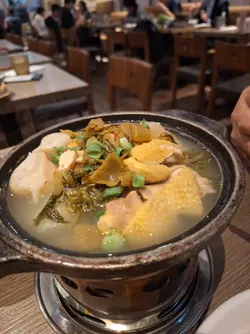 首先是蟲草花粟米甘筍,湯頭清甜,粟米和甘筍的鮮甜與蟲草花的獨特香氣完美融合,喝一口彷彿能感受到食材的天然精華。接著是栗子燉腰果酸菜餃子雞煲,雞肉軟嫩入味,栗子和腰果增添了口感的層次,酸菜的微酸更是開胃,讓人忍不住一口接一口。麻辣無骨鳳爪是另一亮點,辣度適中,麻香撲鼻,雞爪軟糯Q彈,令人欲罷不能。醬油流心蛋則是驚喜之作,蛋黃濃稠香滑,配上特調醬油,簡單卻充滿風味。最後點了醬撈烏冬配上海雲吞,烏冬彈牙,雲吞餡料飽滿,海鮮的鮮味讓整道菜更加鮮活。搭配一杯熱檸水(走甜),清新解膩,為這餐畫上完美句號。
