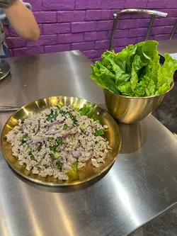 「小曼谷海鮮燒烤屋」之前成日會經過,但今日都係第一次入去食😝 「小曼谷海鮮燒烤屋」裝修都好闊落,而且壁畫前面好似有一個Band台,晚上可能有表演😂😂😂Lunch set都幾多選擇⋯⋯香葉肉碎茄子燴飯(加辣)……呢個拌飯真係冇得輸⋯⋯個肉碎炒得好惹味👍 泰式蟹肉煲仔翅……..$118 ……….都幾足料蟹肉都唔少有花膠有兩粒鮑魚可以足夠2-3人的份量!泰式生蝦刺身,刺身蝦好大隻,而且好新鮮好鮮味!👍