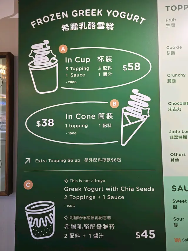 舖頭空間唔大,室內只有企位,室外得一張長凳可以坐幾個人。不過天氣熱,有得食雪糕已經好開心~我揀咗杯裝乳酪雪糕,可以自選3款 toppings 同1款醬。揀咗海鹽焦糖脆脆、綠茶糯米糍、咖啡蒟蒻加熱情果醬。海鹽焦糖脆脆好好味
