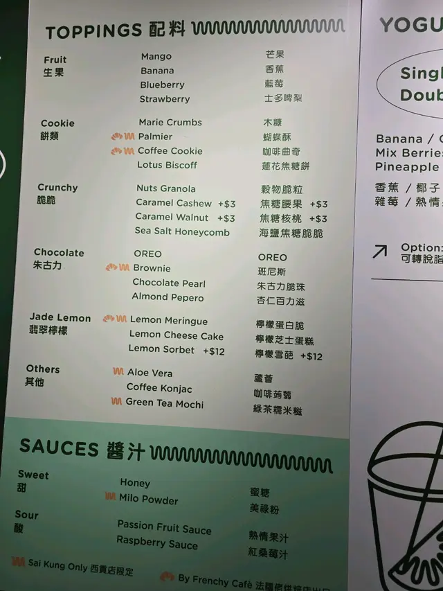 入西貢就緊係要湊吓熱鬧,食呢間希臘乳酪雪糕,今次配料揀咗芒果,檸檬蛋白脆同綠茶糯米糍希臘乳酪雪糕配料1. 芒果2. 檸檬蛋白脆3. 綠茶糯米糍醬汁熱情果汁芒果唔會酸,配上淡淡甜味嘅乳酪雪糕好夾,蛋白脆口感輕盈,帶有一點點嘅檸檬香味,同時又無海鹽焦糖脆脆咁甜,而綠茶糯米糍大大粒,煙靭有咬口,不過綠茶味唔算太濃,今次加熱情果汁做醬汁,佢嘅酸酸甜甜令整體味道更有層次