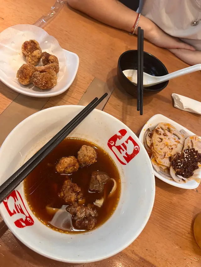呢日係附近行街,到晚餐時間因為選擇困難症揀症勁耐最後揀左食小王牛肉麵。。。我哋叫左半筋半肉麵、台式滷肉油炸大排飯、胡椒鹹菜粉腸鍋同埋叫左杯香芋珍珠奶蓋。 半筋半肉麵肉既份量都夠多,筋同肉都各有3-4嚿,而最驚嘆係啲肉已經煮到好冧,輕輕一咬就散,有一嚿係係肉包筋,岩晒我呢啲鍾意食筋既人😂而個湯底都好濃藥材湯味,不過有少少偏鹹。 而個大排飯就唔係好岩我,佢落左啲類似香料粉係嚿排到,而啲滷肉都唔係普通係台灣食果啲味,有好濃既香料味。所以最後都係我朋友食呢個飯。 而個鍋應該要配飯食會好食啲,因為驚食唔晒我哋無額外叫飯,原本諗住配滷肉飯食,但點知個飯又唔好食🫠 最後變左齋食個鍋,啲粉腸都煮到好冧,仲加咗啲菇入去,味道雖然不錯,但略嫌啲料太少,如果單點個鍋加飯應該都會覺得啲餸太少。最後個飲品就係普通既香芋珍珠加奶蓋,無特別好飲。查看更多