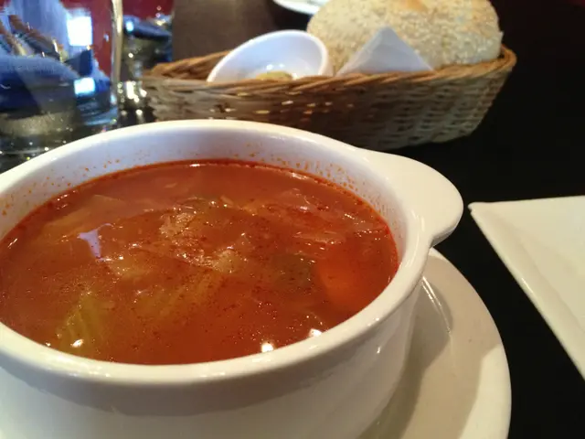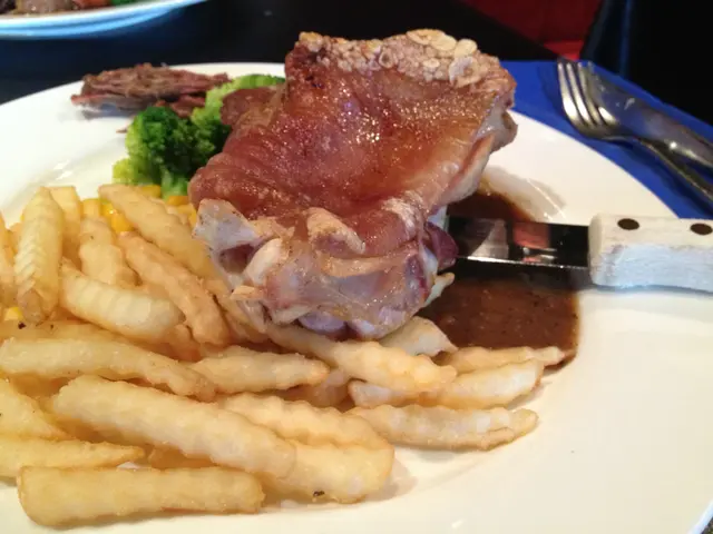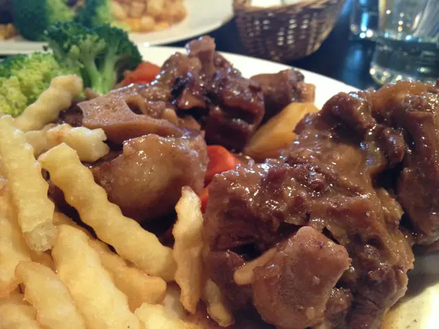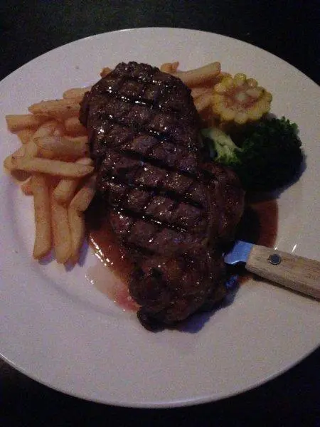 Waiter 留意住我地食左幾多先上下一道菜。食完頭盤係湯。我飲紅湯,甜中帶點辣,有少許蔬菜。雖然唔係好味的羅宋湯,但一飲就知有落料自己煲,收貨。主菜等左耐少少,不過一上黎就知唔係整定放係度。所有Main Course 一上黎都係出緊煙,正!一個Pork Ribs, 一個烤春雞 (唔記得咩sauce) 兩個都好入味,肉好軟,好夠份量。烤春雞幾乎冇骨,小朋友拎住雞脾食得好滋味。伴碟的薯菜一d 都唔馬虎:新鮮的薯條加 grilled veggies