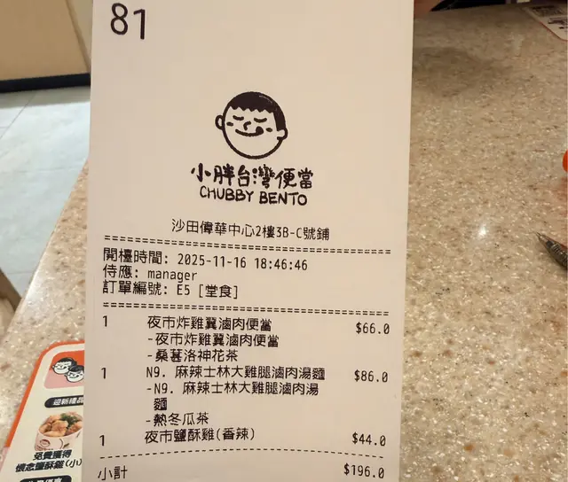今日特登來到小胖台灣便當,想試試佢哋嘅台灣小食!真係食得好開心呀!🍽️ 呢度簡直係窮人恩物 糧尾飯堂 真係好抵食 又大碗🤣 CP值極高!🗯夜市炸雞翼滷肉便當 + 洛神花冷泡茶 $66呢個便當真係好滿足!炸雞翼外脆內嫩,味道十足,搭配滷肉,肉味豐富,飯一齊食真係好香!🍚 洛神花冷泡茶清新解膩,味道酸甜剛好,飲完之後一口氣吃多幾口都冇問題!🗯麻辣士林大雞腿滷肉湯麵 + 冬瓜茶 $86呢碗湯麵真係唔可以錯過!大雞腿煮得剛好,肉質軟滑,湯底麻辣味道夠勁,但冇過火,啖啖都喝得好開心!🍜 冬瓜茶清甜,幫助解膩,搭配真係一流!🗯夜市鹽酥雞 (香辣) $44最後嚟咗呢個鹽酥雞,香辣味道十足,炸得金黃酥脆,每咬一口都令人忍唔住再加一口,簡直係小食界嘅王者!🌶️ 唔食都對唔住自己!整體來講,小胖台灣便當嘅食物味道正,選擇多,真係好值得一試!🔥 符合心靈和味蕾,必定會再回來!…查看更多