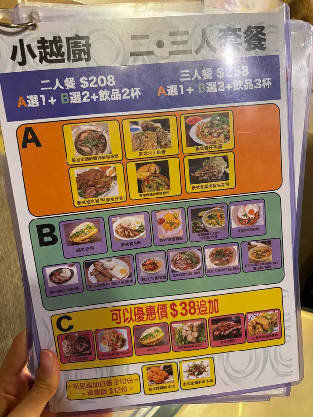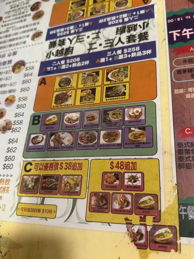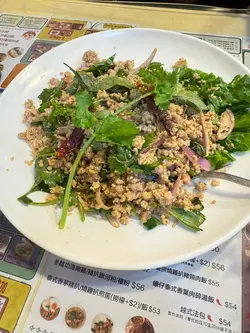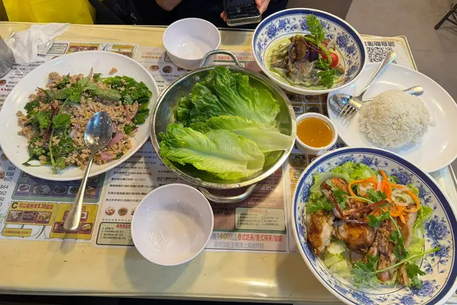 上次食過2人餐又抵食,份量十足,今日同埋屋企人又黎,係食3人餐。泰式香茅豬扒煎蛋飯呢個醬汁唔係預期內既香茅豬扒味,係特別嘅風味,不過有啲咸。越式海鮮春卷包生菜米網外皮炸到香脆,生菜的清新爽脆,搭配各種餡料,層次豐富。冬蔭公豬扒湯河粉呢個湯底有啲辣,唔食得辣唔好叫啊,食得辣嘅就一定要叫,湯底勁濃郁,酸辣開胃,係我今餐最中意~香茅豬扒入晒味,濃郁香料味,香茅嘅獨特香氣,河粉吸飽咗冬蔭公湯底濃郁嘅滋味,好出色。泰式鮮蝦餅蝦肉鮮嫩Q彈,緊實彈牙,再蘸上搭配嘅泰式甜辣醬,酸酸甜甜,瞬間令蝦餅嘅味道昇華咗。青咖喱雞扒飯青辣椒替代了乾紅辣椒,口感酸辣甜清香,是咖喱界小清新。雞肉嫩滑同青咖喱濃郁嘅味道完美結合,每一啖都充滿了東南亞的風情~青咖喱醬汁撈飯食簡直得絕配。泰式火山排骨造型超吸睛,排骨堆成小山狀,似火山一樣,肉質鮮嫩多汁,輕輕一嗦,骨肉分離。靈魂在於獨特嘅青色泰式酸辣醬汁融合左檸檬嘅清新酸再加上魚露鮮味,味道過癮。…查看更多