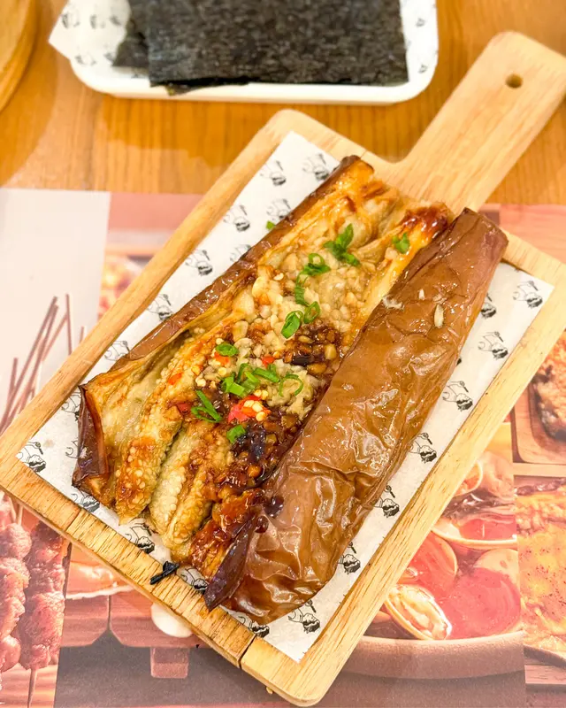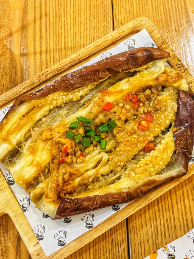 一條茄子燒到茄子肉完全熟透,一絲絲茄子肉夾起,連埋面頭嘅辣椒蒜蓉調味料一併食,滋味無窮。