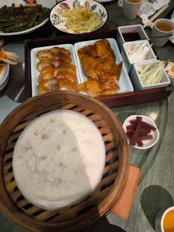 入到裡面環境類似冇地氈既酒樓咁啦, 好彩我地都算人多,分配到角落圓枱,叫左個6人餐,再散叫少少野食。 6人餐 $1358前菜: 雲耳青瓜, 蔥油海蜇, 雞絲粉皮 : 全部正常野, 冇咩特別之後叫左個蒜泥白肉, 我個人鐘意譚仔果D香D… 佢唔夠蒜主菜:北京填鴨: 正常野,有一半皮, 一半皮+肉去夾,唔錯。 值得一讚係佢D餅皮會有野蒸一蒸一陣咁,唔會咁快硬
