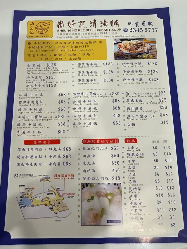 尚好記清湯牛腩 (尖沙咀) 網址: https://s.openrice.com/QrbS0pGOD00 地址: 香港尖沙咀柯士甸道西3號香港西九龍站售票大堂B1樓WEK B1-4號舖 電話: +852 23455777