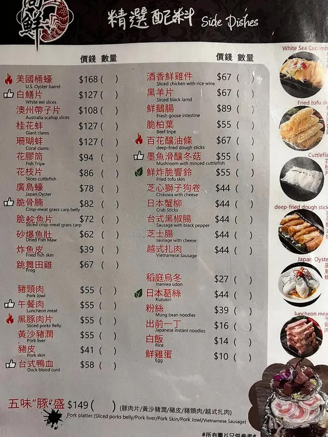 看到好的食評有幾百,差的只有幾個,便很有期望地衝去試試喔!最後都是中伏;首先麻辣湯底很差,似是現成湯包,是我人生中嘗試過的最差一個湯底;海鮮食材不太新鮮,蠔及帶子有點霉霉感,價錢$339相比食材質素很不值,手切安格斯$209只有4-5小片;點菜後上菜需時很久,催促多次還是沒趕快送來;禮貌只是一般,不知道從那裡來的好食評?