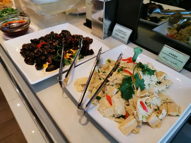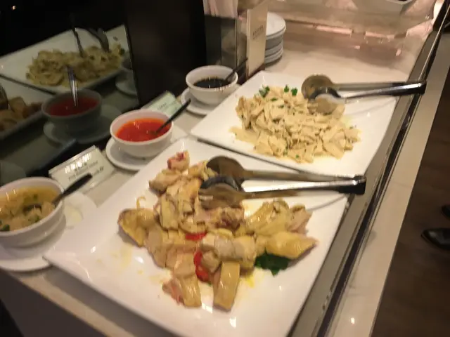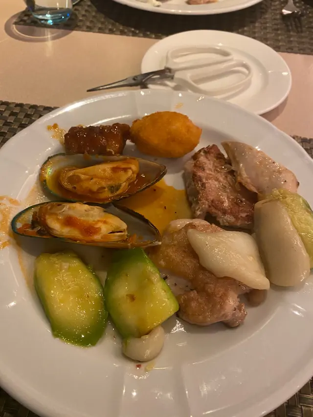 熱葷類選擇有不少,如有雞翼、白菜豬肉餃、蝦餅拼咖喱角、玉柳蝦仁配米通、 瑤柱扒時蔬、生炒臘味糯米飯等等,大多味道不錯