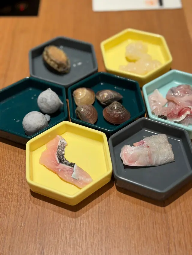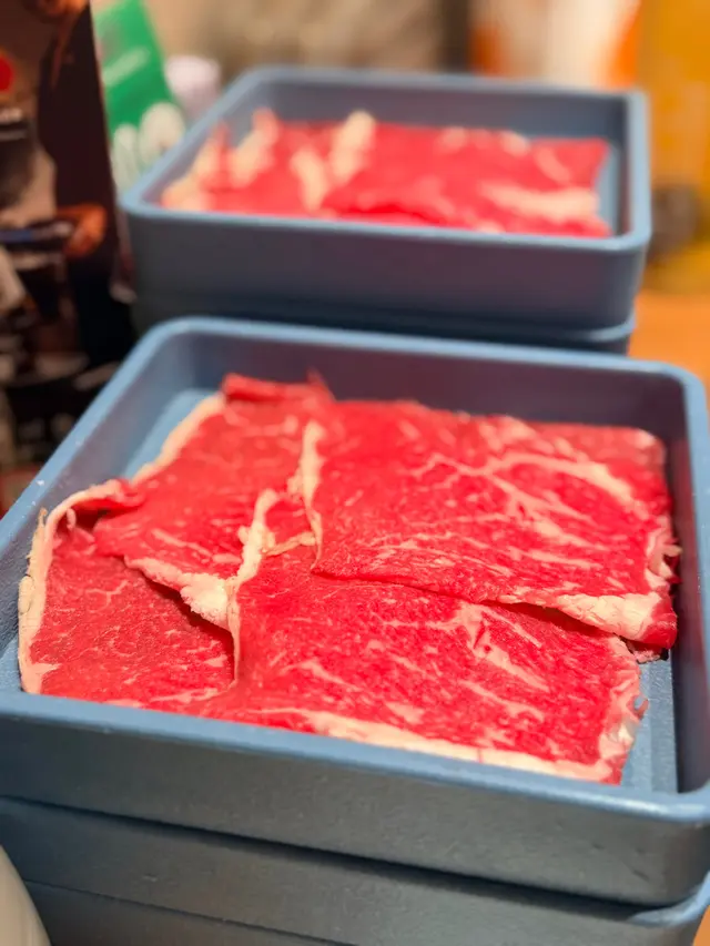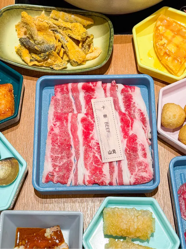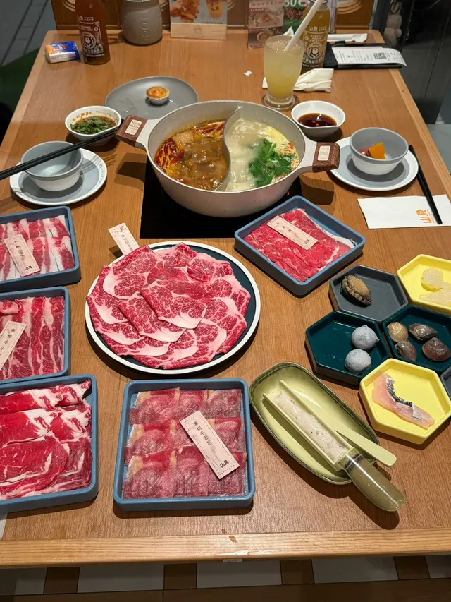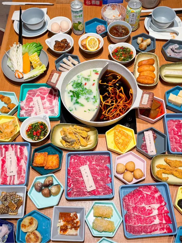 湯底自然是靈魂所在。我們選擇了鴛鴦鍋,一邊是滋補養生的「上品蟲草木耳鍋」,另一邊則是清甜鮮美的「椰子雞湯」。兩款湯底各有特色,前者滋補養生,後者清甜味美😁完美搭配不同食材。食材方面,山見的選擇非常豐富,而且擺盤精緻,尤其喜歡他們六角形的碟👍🏻讓桌面看起來整齊又美觀。🤎肉類特別推介🥹油花分佈均勻的「澳洲和牛肩胛肉眼」、口感豐富的「美國黑毛豬」,