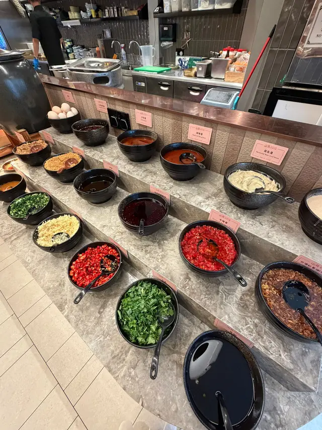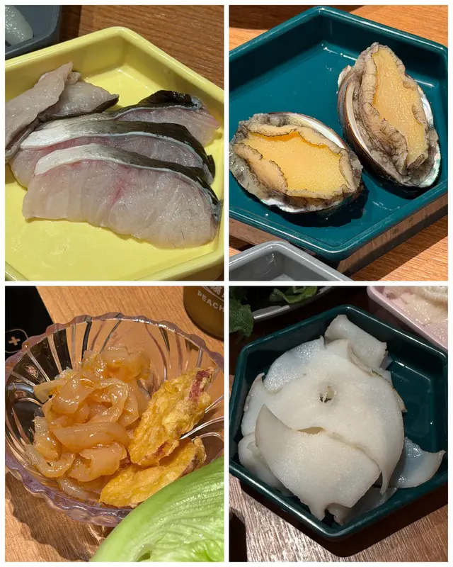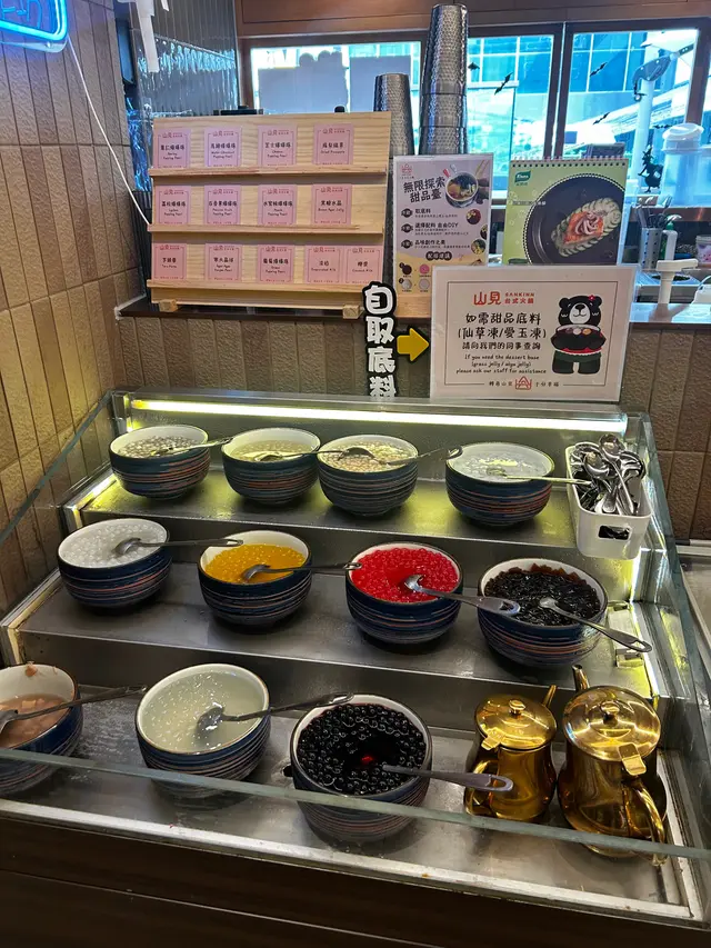 而「牛扑肉」和「牛爽腩」都唔錯,輕涮幾秒就食得!肉質鮮美,令人回味無窮。💙海鮮除了肉類,冇諗過海鮮的選擇都唔少!有大隻飽滿的鮮蝦、新鮮的蜆,甚至還有鮑魚和彈牙的墨魚滑😜本人特別推介蜆!大大粒冇砂又鮮甜!💚蔬菜與配料自助區提供了大量新鮮蔬菜,從南瓜、金菇、豆苗、粟米、粟米筍到菠菜和生菜,種類繁多,完全不用擔心「冇菜食」!💛醬料與特色小吃山見的醬料區同樣令人驚艷,選擇多樣,可以自由搭配出個人喜愛的風味。我自己特別推薦「金桔醬」,搭配豬肉簡直一流!此外,還有自家製台灣紅蔥油,用來搭配牛肉也是絕配。除了火鍋料,餐廳還提供了一系列特色小吃,其中最引人注目的是充滿「港式情懷」的咖喱魚蛋,還有各種炸物都是受歡迎的選擇。💜飲品與甜品山見的飲品和甜品區更是豐富到讓人眼花撩亂!要去多幾次先試得晒所有飲品😂呢度特製的樽裝「白桃烏龍」就最啱我,清新解膩!甜品絕對不能錯過!有栗子撻、精緻蛋糕、爆谷、軟糖,以及各種口味的雪糕和雪條。特別是「台式愛玉仙草」和DIY配料區,讓食客可以根據自己的喜好搭配,創造出獨一無二的甜點。茉莉花茶雪糕和士多啤梨乳酪雪條,兩款都好好食!😍額外驚喜玩埋「尋寶樂園」夾公仔遊戲!食得越多玩得越多~