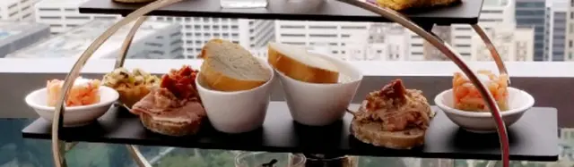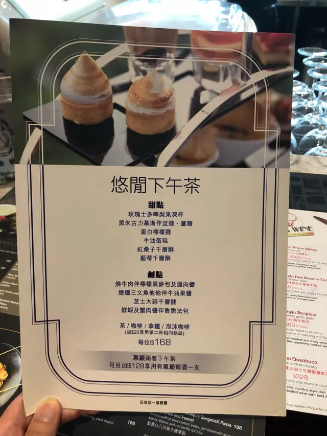 這店的下午茶點心架是幸福摩天輪,脫胎自英國貴婦餐桌上的三層點心架。沒有花枝,沒有道具,沒有場景擺設,沒有轉輪裝置,沒有異國情調,沒有嬌豔造型 ; 全因有凌雲的露台,露台上幾套簡樸的高桌椅,椅上有一個妳。點心架與網上海報十分相近,圓形的金屬架,配上黑色玻璃 ; 在桌面玻璃的映射下,它與天色共融,亦映入她的俏麗面龐。它比中環的摩天輪更接近天際,在灰矇的天氣下,觸手可及。它彷彿隨風流轉,訴說著我們的輪轉往事。此店的前世座落在山頂廣場,以峰景取勝,牛扒餐和生蠔兩大重點食物淪為配角。在那些年,情侶喜在此店共晉晚餐,即現在的「打卡」,取得存在感,認同感。當時妳是女主角,我連做配角的資格都沒有。🎡酸當年這種感覺是酸溜溜的。如今我們共嚐下午茶點心架,由左方酸溜溜的「蛋白檸檬撻」開始。蛋白檸檬撻有厚厚的酥撻墊底,很有質感,外型像學校的閙鐘,令我們聯想到書卷味的日子,酸秀才的酸味與檸檬蛋白的濃酸交纏在一起,酸得令我有點兒心酸。它擺設在上層的左方,寓意由此入門,酸味令饞蟲活躍,增加食客的意慾。我倆覺得倒有需要,因點心份量十足,要在此消磨4小時才能消化掉,平均每20分鐘食一件。下午茶點心架套餐十分抵食呢 !第二份茶茗是酥餅。撻如面,宜薄,勿有飽腹肥膩感覺 ; 酥餅如心,宜多層細密,輕鬆,空間足。「藍莓千層酥」號稱千層,卻遠不及生果拿破崙的脆皮甜蜜,始終類型,價格不同,不宜強比。「紅桑子千層酥」則十分討好,有草莓的驚世紅豔,有適度的酸味。世人多鍾情紅莓,把她許配給蛋糕酥餅,忽略其嬌小妹妹,她潤喉補眼,更不會酸溜溜的。紅桑子啊 ! 我欣賞妳,我們都被人忽略,命運類同呀 !🎡咸第二層是咸點,分兩類。食美饌如交友,宜由淡漸濃。我先食「燒牛肉伴檸檬黑麥包及煙肉醬」,名字很長,其實是燒牛肉麥包片。伊人負笈法國,對此物十分熟悉。她說煙肉醬調教得不出衆,令牛肉片淡而冰涼,麵包的質感和新鮮度亦強差人意。宜化為細片和疊起分層,淡化西式粗豪味,令味蕾感覺到有層次的觸碰。她仍是那麽執著,在寒風中,坐在高凳上,是鐵娘子,是銅像而不可靠倚。「芝士大蒜千層撻」卻令我十分驚喜。芝士,蒜味濃郁細緻,繞蕾三匝,千層鬆化感技勝前者的千層酥,份量纖纖,配合她的櫻桃小嘴。🎡鮮女士多鍾愛粉紅色,「煙三文魚他他伴牛油果醬」能獵取她的芳心。煙三文魚被切成細蓉,光潤如鮮三文魚 ; 他他醬如銀髮白絲,令她更有味道風韻 ; 牛油果醬厚厚的,如曳地翠裙,亦如她的裙下之臣,爭著來配合她的口味。原來牛油果和三文魚是天鮮配,清新可人。「鮮蝦蟹肉醬伴香脆法包」亦是大份量的,法包不大,醬則滿載一小杯,告訴我們蝦蟹肉才是主角。蝦蟹肉咸鮮度強烈,恰似彿面海風,恰似夾送海水味。法式長包在卿卿嘴前班門弄斧,稔而乾,亦不新鮮,不合格。🎡甜五時許,暮色漸深,食到第三層。「牛油蛋糕」是尋常物。「黑朱古力慕絲伴豆蔻黑糖」是整個點心架最甜的茶點,留下絲絲甜蜜。現時流行偏淡甜的,所以「玫瑰士多啤梨果凍杯」才是甜品之花魁。雖有士多啤梨,卻一點兒不甜不俗不漏不濃不假,反有清香果味,令我們酣暢淋漓,滋味無窮。翠袖搖曳,她以飄洋人評此套餐,覺得頗對勁,沒有英國式痕跡,微有巴黎風格。十茗味盡嚐淡,濃,酸,甜,酥,咸。願妳的一生都淡定情濃,由酸漸甜,甘飴咸豐。更願與妳同坐人生的幸福摩天輪,高高低低,寥落時為你摘星於高空。正如此華厦名稱,誰是妳的The One ?鄰新尖東一酒店有摩天輪下午茶供應,既不露天,金輪只是背景擺設,與食物無任何關係。🎵🎼幸福摩天輪🎼🎶甜甜飴飴,酥酥迷迷。矇矓中海水味與魚味相隨。「唯一」中露台登高,點心十味,味蕾中驟來蕩去,無匱無慮。一點心意流連在摩天輪,在峰景遙望維港流動。酸溜咸鮮在口腔互湧,濃淡甜跌蕩,有迎有送。當點心似流連在摩天輪,在卿瞳孔,在小嘴流動。啖茗飲啡如吻到星空,有你不怕溫低,忘記風凍。🎡晚餐下午茶是特價時區,每位只花費168元(包一杯飲品)和加一費。其餘時間俾人感覺價格頗貴,景靚物非。其實價格很克制,侍者服務如酒店。在主餐牌,如有策略地挑選食品,性價比仍高。下午茶客只可坐至18:00,正是華燈初上時。在露台和她續坐,正是我的鬼主意。拉下夜幕,換了背景,灣仔至西環璀璨燈飾迷惑了久在異鄉的她。室內的格調也像法國貴婦,不昏暗,線條簡約,配合店名,有藝術風格Art Deco。室外才有冷豔的「峰景」,才是食星光晚餐。晚市套餐有平至208元的炸雞卷,包藜麥沙律和甜品。要食得有質素,除吃牛扒和即開生蠔外,宜參考下列二人共享浪漫餐單,花費627元和加一費,每人付345元而已。橙金色的龍蝦湯馥郁濃稠,如醬似粥,令人齒頰留鮮,80多元不昂貴。主餐牌加配價98元的香煎鵝肝亦便宜,比晚市套餐加配價便宜了20元。香酥醉人,外脆內軟,味腴甘甜,這位法國少婦亦感愜意。主菜我們食澳洲羊扒,268元有5件羊鞍,不同凡香,只有輕微羶味,大量腴甘滋味,感到幸福滿盈,身也溫暖了。夜已深,她的第二個胃飢腸轆轆。我冒險地為這個旅法人獻上「法式焦糖燉蛋及火焰冧酒」,熊熊烈火令她饞涎大滴,淡黃冰「湖」泛起漣漪,映襯她的貪嘴和粉面。「冰」脆甜,在小嘴崩裂有聲,帶來微熱 ; 燉蛋芳香雪凍,冰火交戰,迂迴盪漾,歷久不散。份量大,95元不貴。壓軸是Matcha Fondant抹茶心太軟