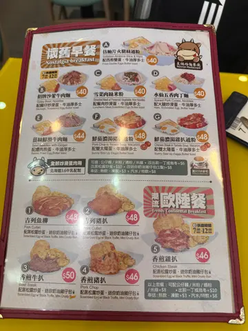 前日(1-5-2025 Thur)假期朝,同老公落荃灣做啲嘢,咁食個早餐先,去邊喥食,冇idea,不如又呢間啦.我哋嚟到時,剩低最後一張卡位,印象中上次都係坐呢張枱(上次食評係2023年6月17日刊登嘅呢篇:https://www.openrice.com/zh/hongkong/review/%E9%A3%9F%E5%BE%97%E5%90%93-e4861269),果然係,然後我哋睇完menu,就要:4. 跟餐嘅熱檸水正常冇乜問題.3分2. 跟餐加$3.00嘅凍檸茶老公飲嘅,佢話正常冇問題.3分1. $40.00嘅五香牛腩河老公食,我冇食到,佢話正常冇問題.佢又呢喥嘅辣椒油,因為有芝麻夠香.3分3. $46.00嘅香煎雞扒歐陸餐呢個配松露炒蛋,迷你奶油豬仔包一個,睇見雞扒同松露炒蛋份量都唔錯,先食松露炒蛋,係全熟,所以唔係好嫩,只係淋咗蛋汁喺上面;2分香煎雞扒味道正常冇問題,但口感係乾柴,juicy位係有但少;1分迷你奶油豬仔包有烘過,奶油份量啱啱好,但豬仔包有嗅燶味,難食.1分服務:坐低後會自動俾兩杯茶,亦會講聲早晨.但企喺喥等落單,我哋都未睇menu.環境係4.5分, 抵食係 2.5分