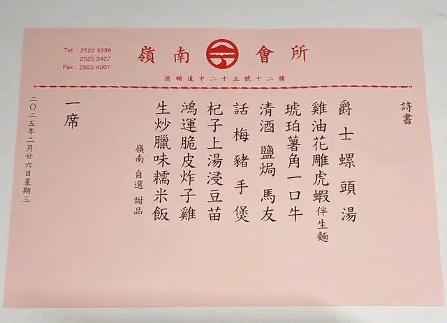 嶺南會所 (中環) 網址: https://s.openrice.com/QrbS0VIe000 地址: 香港中環德輔道中25-27A號安樂園大廈12-13樓 電話: +852 25223339