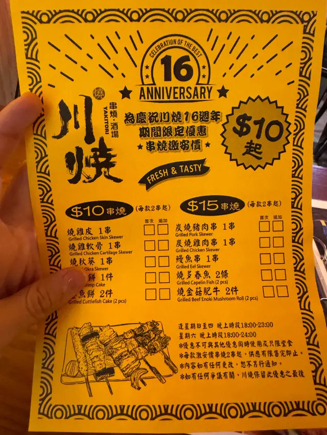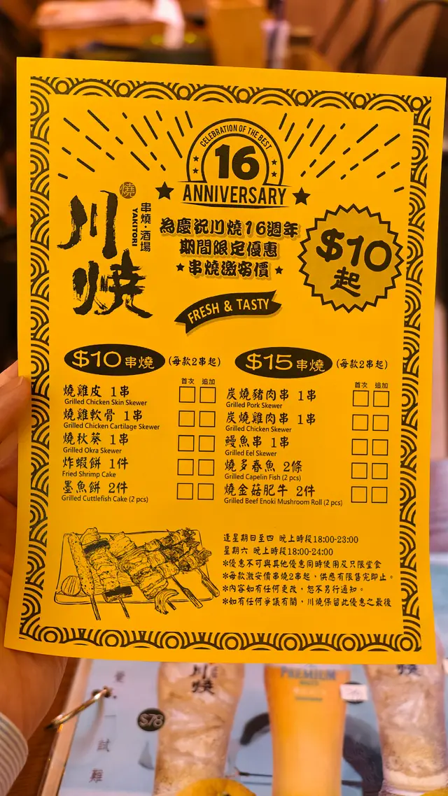 <川燒 串燒·酒場 > @chuanshaoshop新登場高壓鍋乳山蠔🦪!16周年優惠串燒$10起🍢,宵夜至凌晨2點營業🌙,氣氛chill又啱同朋友小酌🍺打卡必到!#mochicouple_hk灣仔搵食團⸝⸝⸝♡ ꔛ ꔛ ꔛ ꔛ ꔛ ꔛ ꔛ ꔛ ꔛ ꔛ ʕ´•ᴥ•`ʔ ‧˚以下為mochicp推介😜1️⃣ 高壓鍋蒸乳山蠔 4隻$138四隻飽滿嘅乳山蠔經過高壓鍋處理,高壓鍋讓蠔快速鎖住水份~✨口感一級,蠔肉彈牙卻不硬,勁爆汁!加上店家貼心搭配醬汁~2️⃣燒蘇格蘭蒜蓉粉絲蟶子王$58蘇格蘭蟶子王大隻厚身,燒至外表微焦、內裏仍保留嫩滑~上面鋪滿金黃蒜蓉、粉絲吸足蟶肉鮮汁~層次極高3️⃣黑松露醬燒鮑魚(預訂)$44厚切鮑魚燒得外層微焦但內裏依然嫩滑~燒烤技術到位。鮑魚本身有厚實口感,加上黑松露醬香而不膩!4️⃣野椒汁燒牛小排$58牛小排炭火烤得外層微焦、內裡仍保留粉紅肉心,咬下去汁多肉香,野椒汁辣味先輕後勁,尾韻帶微微煙燻感😍5️⃣燒泡菜黑豚五花腩$28黑豚五花腩燒至外層金黃微脆,咬落去食到豬肉油潤同泡菜酸辣刺激!😋6️⃣椒鹽脆香粟米條$38😍~呢碟粟米條炸到金黃酥脆,每條都均勻掛滿椒鹽粉✨,咬落外層酥得嚟帶微微鹹香,入面仲保持住粟米粒嘅甜味同水分💦~7️⃣麻辣粉絲金菇娃娃菜-少辣 $48💥~金菇同娃娃菜鋪底,吸滿麻辣湯汁🌶️,粉絲吸汁到爆,每啖都麻香滑溜又帶少少辣度😋,就算係少辣版本都夠味到飛起!8️⃣燒墨魚餅 2件$10墨魚餅燒到外脆內軟,墨魚香濃而帶微彈性💦~唔會乾硬~絕對係小食首選!9️⃣燒鰻魚串$15鰻魚燒到表面微焦,光澤閃亮✨,咬落肥嫩滑溜💦秘製燒汁香甜微鹹,建議用紫菜包住黎食~有另一番滋味🔟炭燒豬肉串$15豬肉串微焦香脆,肉質彈牙,醃料鹹香適中💛,咬落肉汁噴出💦~🍺⸝⸝⸝♡ ꔛ ꔛ ꔛ ꔛ ꔛ ꔛ ꔛ ꔛ ꔛ ꔛ ʕ´•ᴥ•`ʔ ‧˚🌟想知道更多美食🤪記得follow@mochicouple_hk啦😍🎉📸📍灣仔駱克道399號地舖🚇銅鑼灣站C出口,步行約5分鐘🕒Mon-Fri:12:00-15:00,18:00-02:00,Sat:18:00-02:00,Sun:Closed#香港 #香港美食 #灣仔 #灣仔美食 #香港日本菜 #香港日式串燒 #串燒 #居酒屋 #生日 #生日會 #蠔 #肥美 #酒 #日式 #日式料理 #sakebomb #慶祝 #小店 #好食 #串燒居酒屋 #灣仔串燒 #蟶子 #鮑魚 #海鮮 #海鮮串燒…查看更多